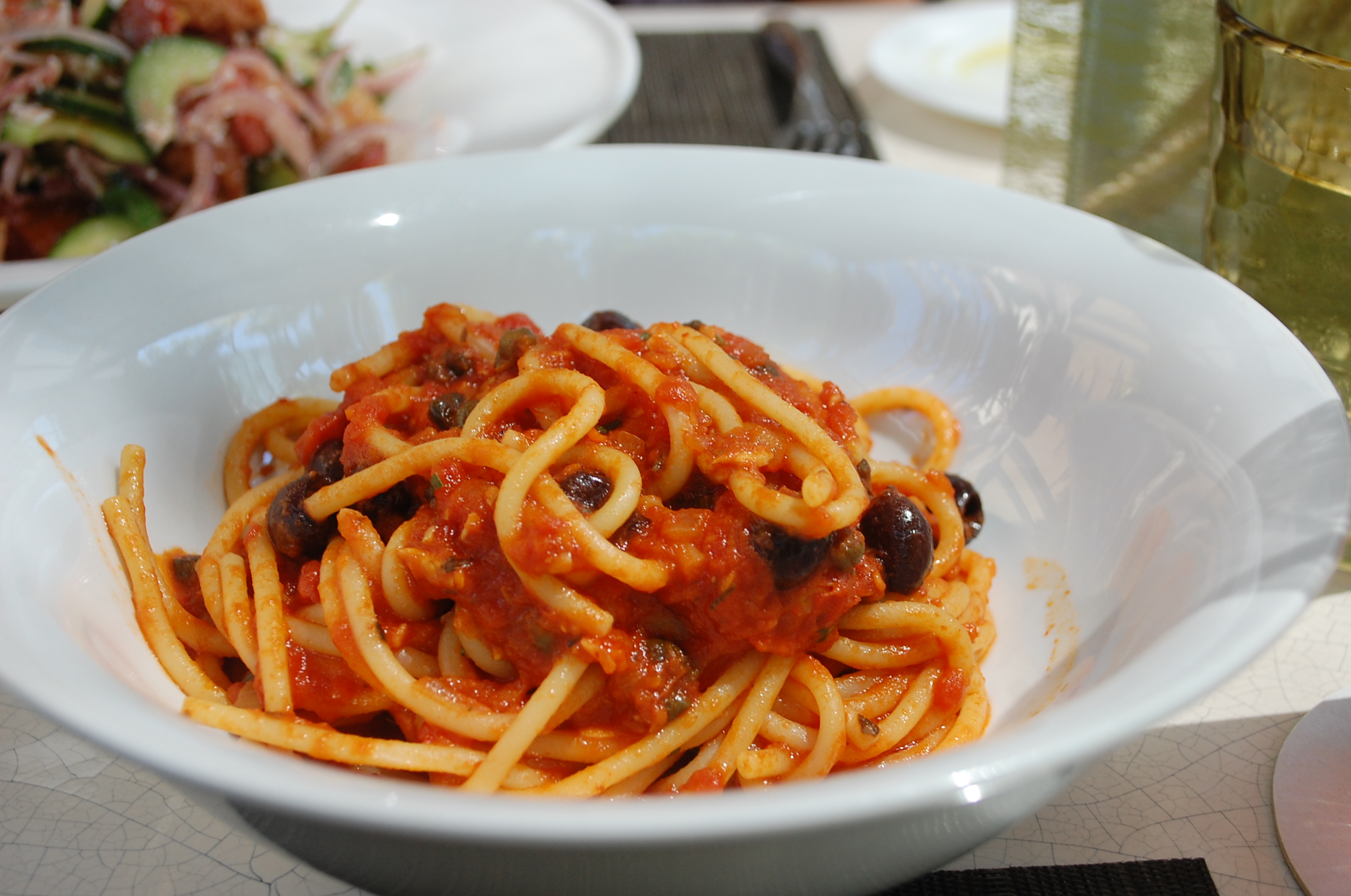 with tomatoes, black olives, capers and anchovies served over thick spaghetti-like pasta with a hole running through the center. Its fragrant aroma proved to be pleasing to the palate. She inquired if I knew the story of how Puttanesca was created? When I replied “no” she preceded to tell me two versions. The first is that Puttanesca sauce originated by the “ladies of the evening” as a quick sauce that could be made in-between clients. Another tale is that the ladies would make up a batch of this flavorful tomato sauce to lure and entice “clients” into their place of business with its fragrant aroma. I was seduced into ordering a bowl of the sexy and slightly spicy dish.