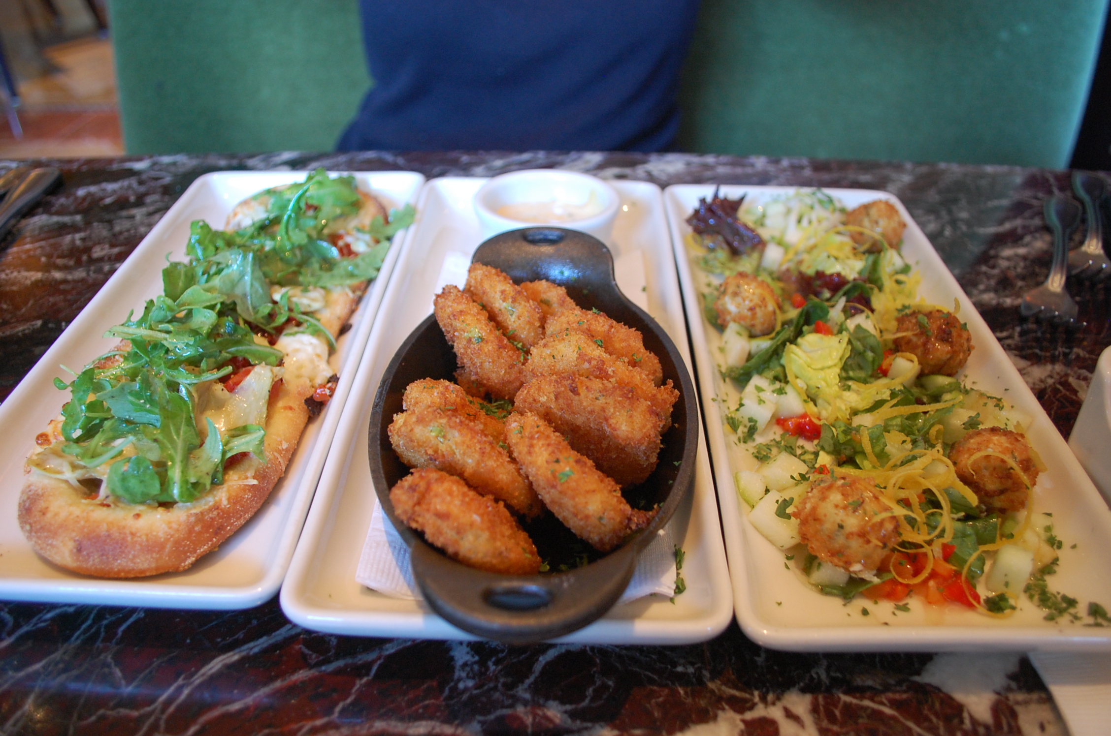 While dining for lunch, I asked the waiter what dishes are popular? He replied, “The crispy calamari is the number one appetizer sold.” It arrived with a warm Marinara sauce and was a tasty treat. Another top seller is their BBQ pork sliders topped with cole slaw. I thought I would order something healthy, so I requested the beet and ricotta salad with arugula, fresh oranges and hazelnuts. It was refreshing. Next we were curious about the fried pickles. How often does one see that on a menu? They arrived warm with a tasty Remoulade sauce and were crispy, yet soft in the middle. They tasted heavenly. For an entrée, we ordered the Mahi Mediterranean. A crusted fresh Mahi fish arrived on a bed of mashed potatoes with roasted tomatoes, artichokes, capers, basil and topped with a olive oil and balsamic vinegar sauce. The portions are large and can easily be shared by two people. We were pleasantly surprised about how savory the sauce was in this dish. It had a hint of sweetness, yet pleasant to our palettes.