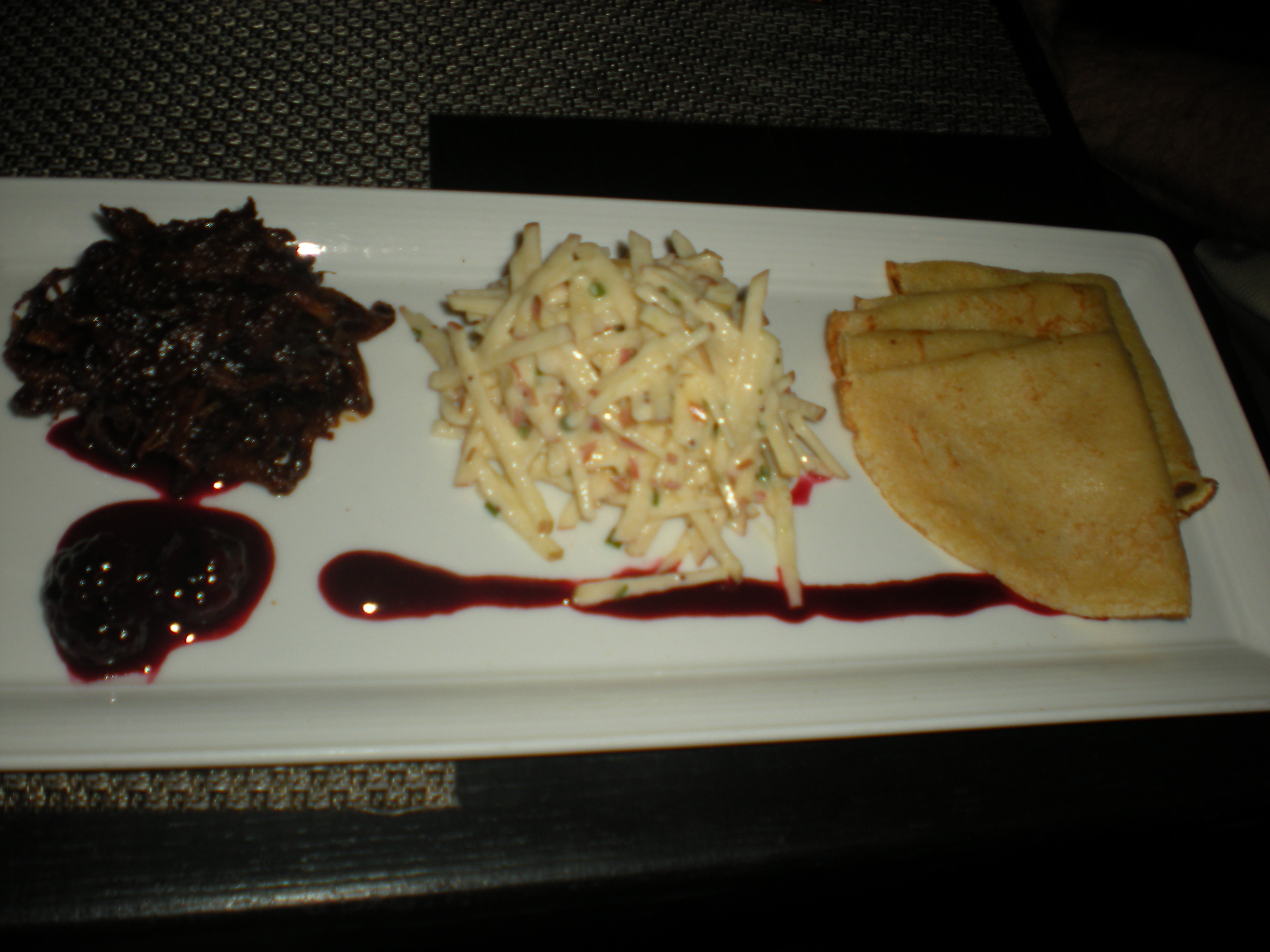 One of his favorite dishes to prepare is the Dungeness Crab Cake. Instead of bread for filler, Chef Jesse whips up a shrimp mousse and adds big lumps of crab. The cake is placed in a pool of lobster lemongrass sauce and a dollop of tomato jam. It tasted rich with a hint of shrimp. The warm asparagus and mushroom salad with shaved and slightly melted reggiano was a wonderful surprise. Underneath the salad is an “egg in a hole”. When I cut into the salad, warm egg yolk bathed the brioche bread. Another appetizer is the beautifully cooked duck carnitas served with apple slaw, chipotle blackberries, and cornmeal crepes. We spooned the dark carnitas meat and apple slaw onto the crepe and placed a chipotle blackberry on top before folding it into a taco. It was superb.