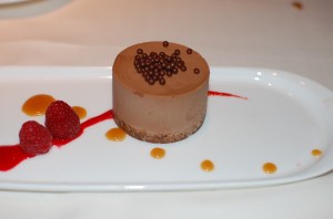 decorated the top of the mousse-like dessert with a rice crispy base and raspberry puree.