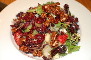Ritchey lost over 110 pounds in less than one year by creating and eating the Antioxidant salad. I had to give it a try. Not that I need to lose that much weight, but wow, what a testimonial to lose and maintain her new ideal weight by having this salad as one of her daily meals. Chopped and mixed with the baby greens from Scarborough farms are red seedless grapes, celery, apples, dried cranberries, blue cheese, mint, red onion, cucumber and strawberries with pomegranate and whole grain mustard dressing.
