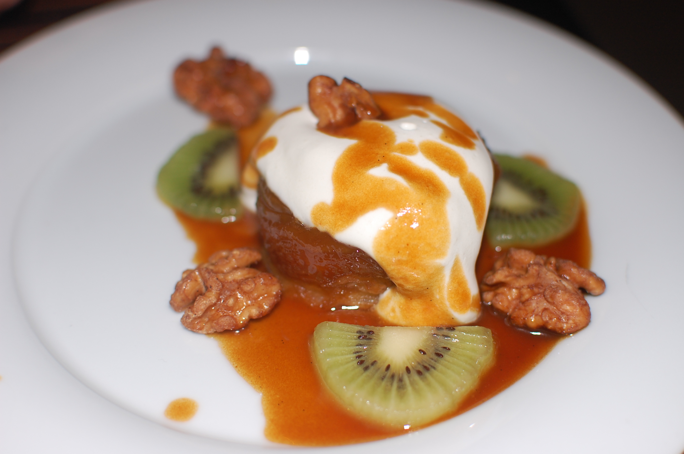 kiwi fruit, spiced walnuts, puff pastry with a generous dollop of whipped crème fraiche and embellished with caramel. My favorite was the chocolate caramel tart with little scoops of bitters and orange ice cream bathed in chocolate sauce.