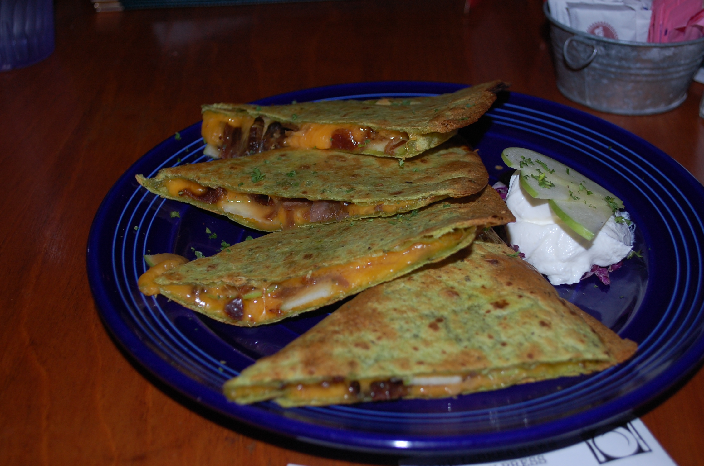 This spinach tortilla quesadilla with melted cheddar cheese, thinly sliced Granny Smith apples, caramelized onions and drizzled with a pear and apple butter was served warm with sour cream and Granny Smith apple slices. It was one of the high points of our meal.