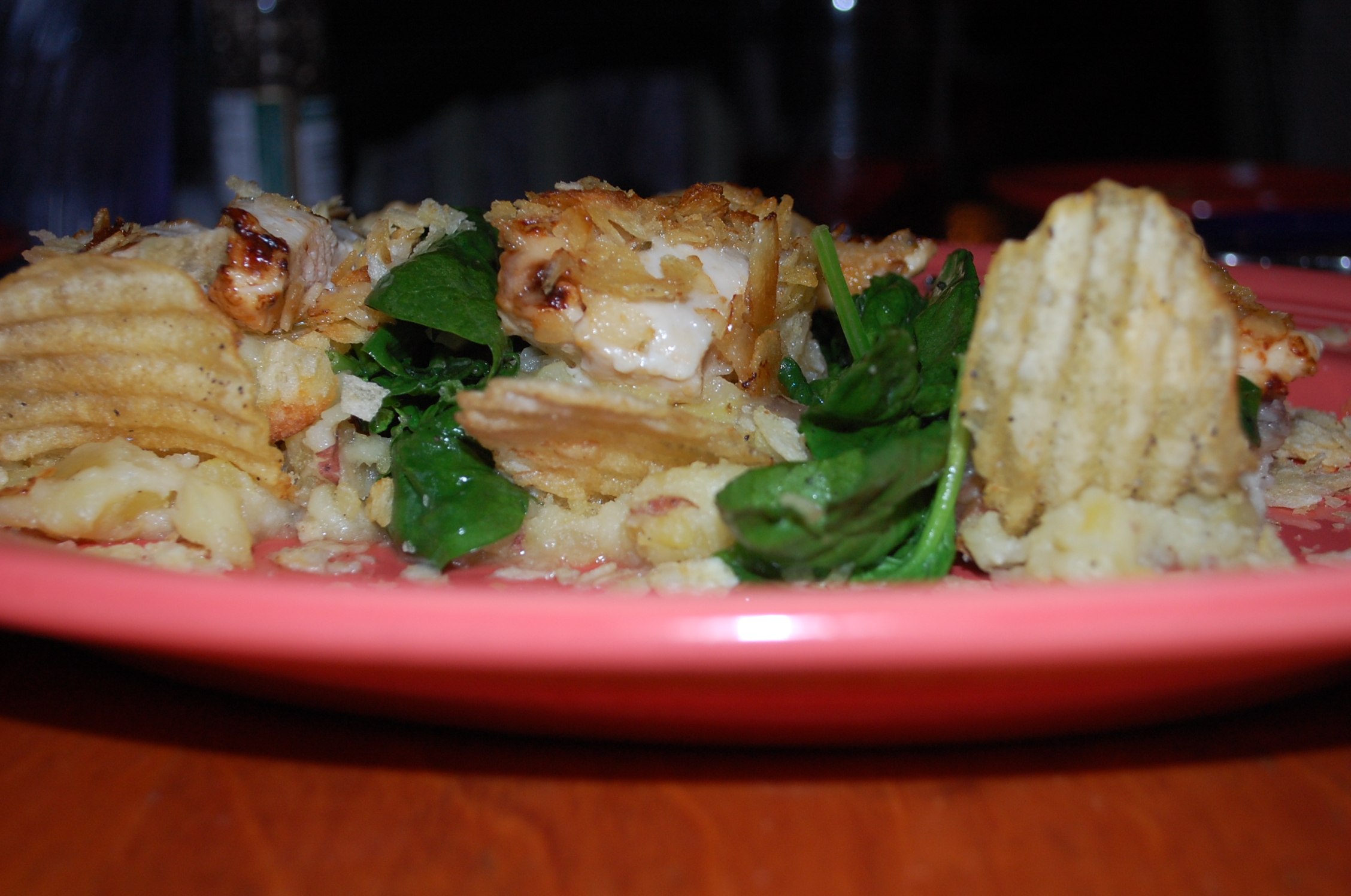 with crispy potato chips before its baked and sliced onto mashed potatoes and sautéed spinach. Almost every table had a guest enjoying this unique chicken dinner.