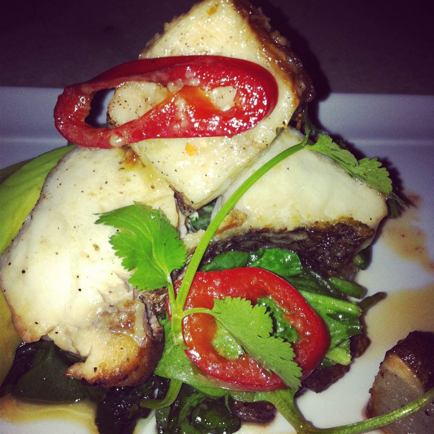We also tried the fish special of the evening, a sea bass with spinach and roasted potatoes. Sliced robust red chili peppers were placed around the dish.