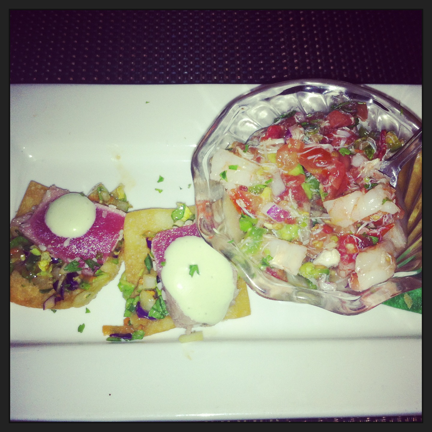 We started with creative Ahi sliders served on square crisp wontons. The seared tuna rested on slightly spicy vegetables and topped with a mild wasabi aioli. Next to the plate was a colorful bowl of ceviche filled with chopped Florida rock shrimp, blue crab meat, pico de gallo, chopped avocado and a squeeze of lime on top. It was accompanied with tortilla chips for dipping.