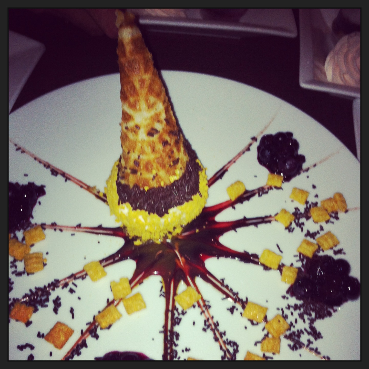 Just when I was about to bid adieu to the group, a platter of “fun” desserts lured me to stay a while longer. The first to catch my eye was the maple bacon ice cream drumstick surrounded by Captain Crunch and a blueberry compote.