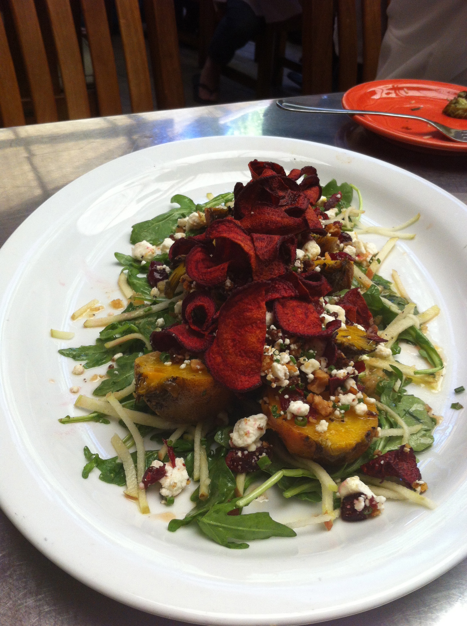 The day I had lunch, I enjoyed his fresh roasted beet salad with burrata, arugula and crisp beet chips. Another spectacular dish was a white flat fish steamed in parchment paper with Napa cabbage, celery, carrots and red peppers. Hugenberger adds thin slices of yellow squash and zucchini to resemble colorful fish scales. He tops the fish with some Thai chili spice to add a touch of heat. It’s served with Jasmine rice to cool it