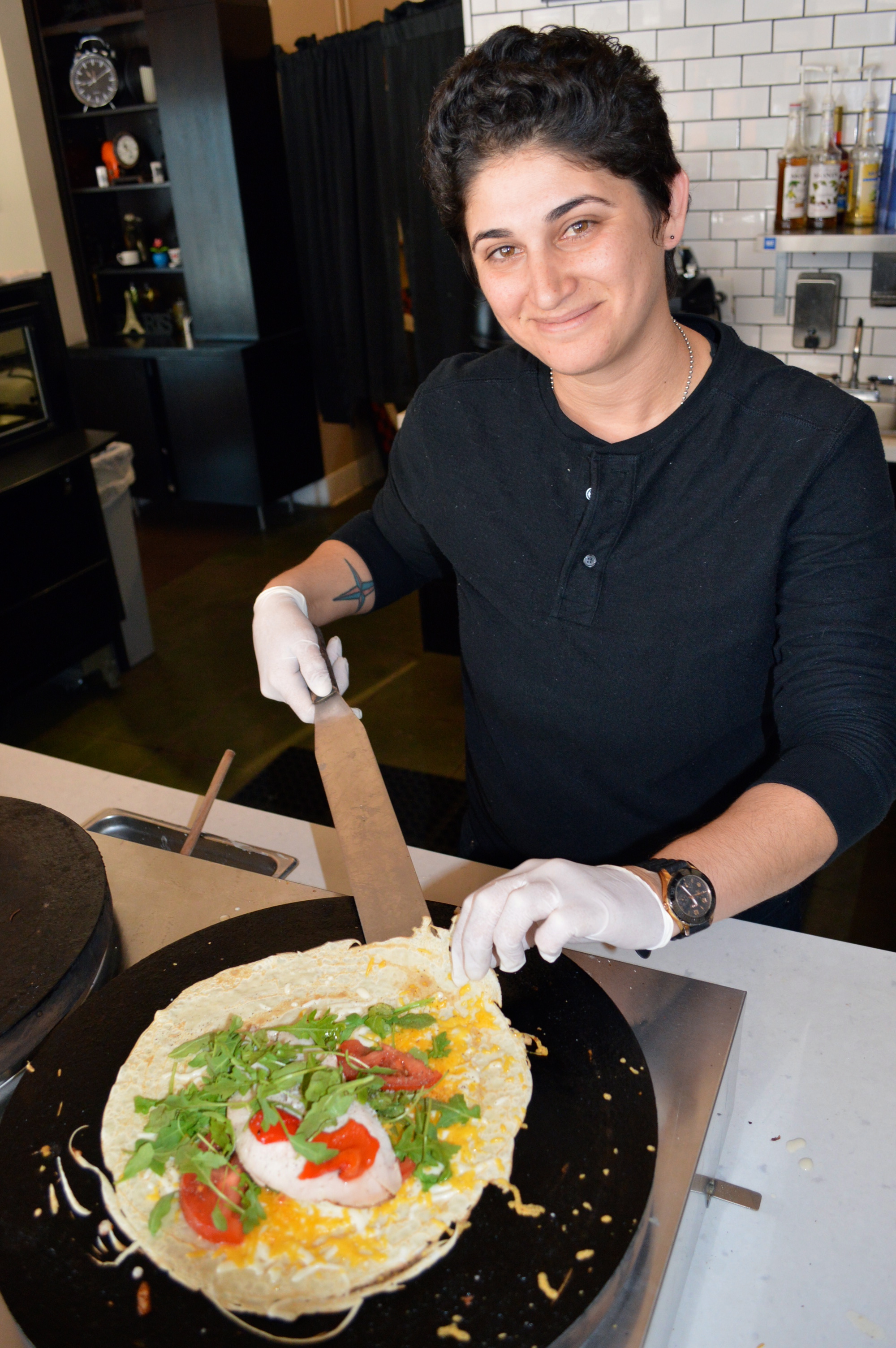 Barades is an expert crepe maker, and I tasted her Italiano with turkey, melted mozzarella and cheddar, fresh spinach and basil, tomatoes, roasted peppers and pesto. The
