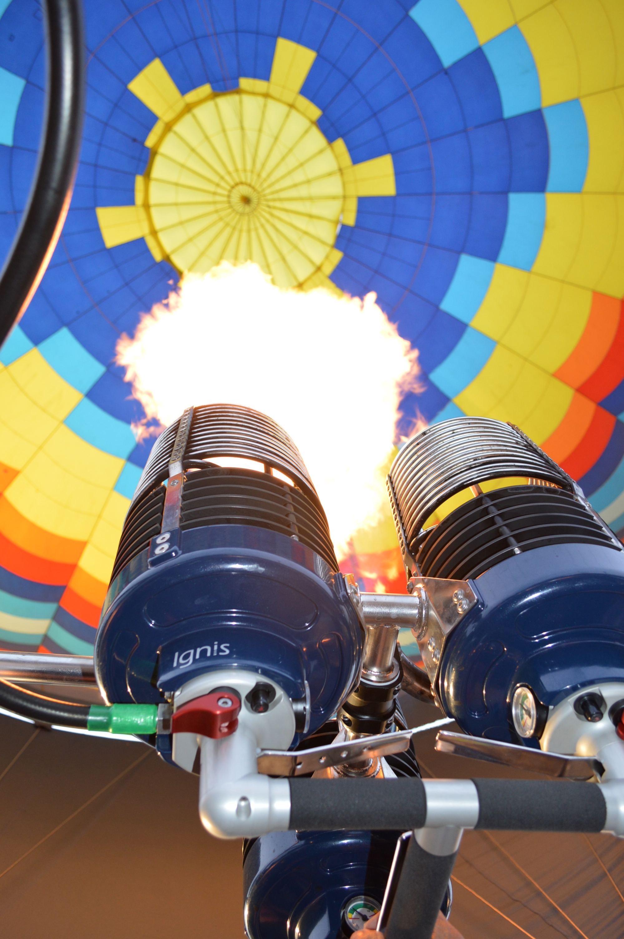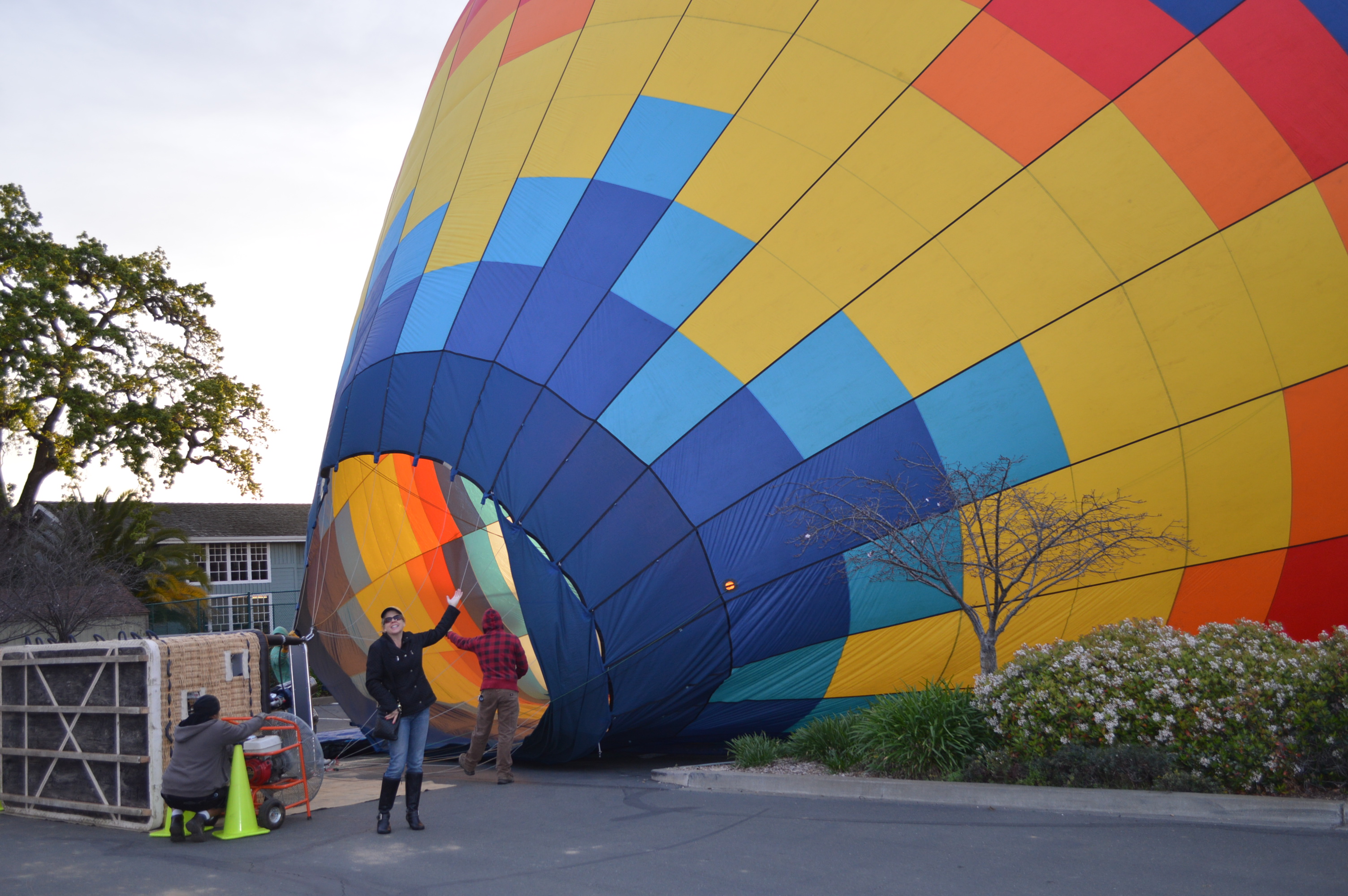 We walked into the parking lot of the V-Marketplace and watched the crew put tarps, large wicker baskets and deflated balloons in a multitude of colors on the asphalt parking lot. Propane gas canisters were secured to start inflating these magnificent balloons.