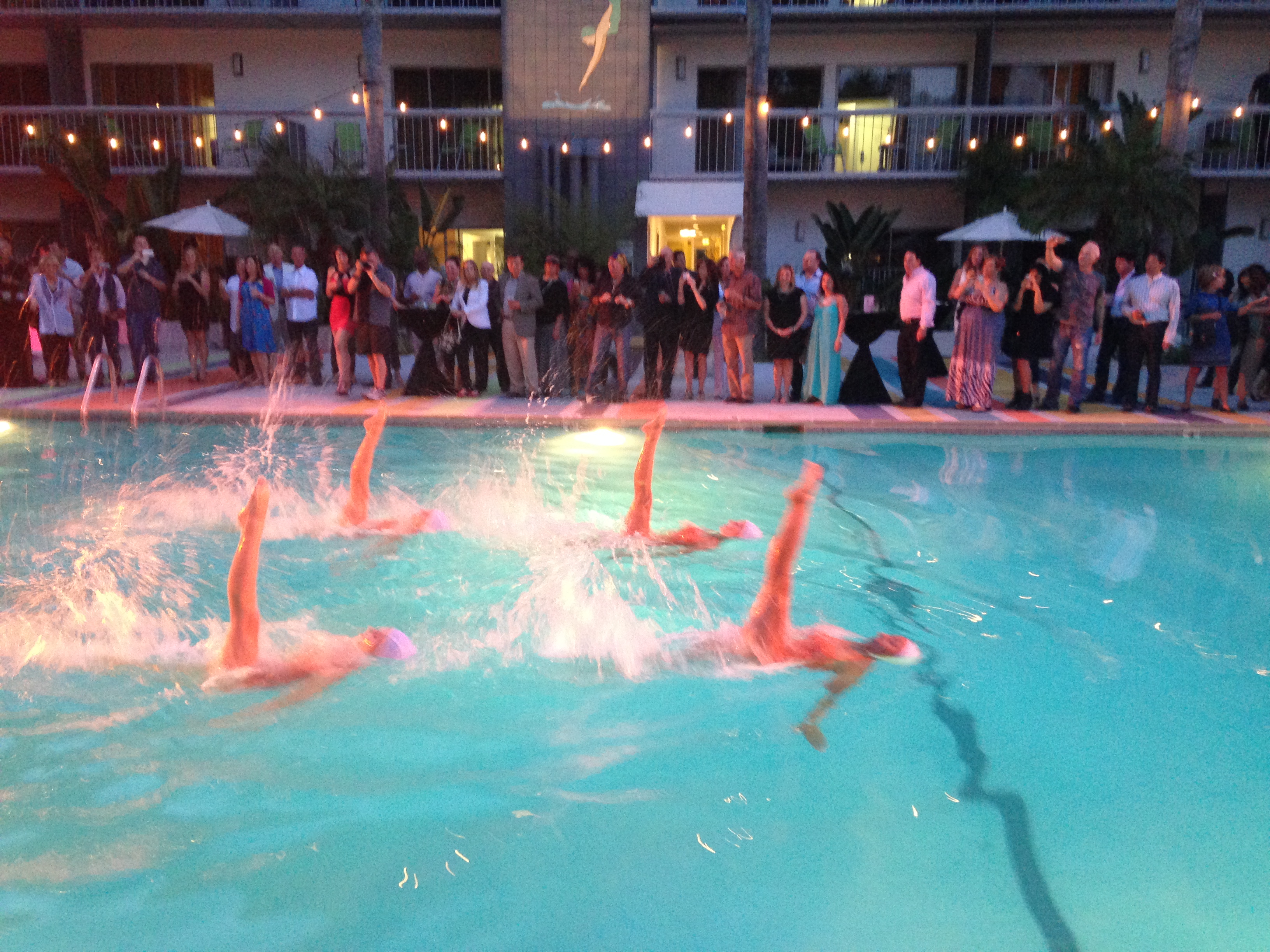 Last weekend, the hotel had a Grand Reintroduction Party with food, drink, tours of the newly renovated guest rooms and two synchronized swimming shows. I was mesmerized by the eight girls dressed in golden one pieces doing water ballet in the oversized swimming pool. It reminded me of the Esther Williams movies. Williams popularized synchronized swimming during WWII and after, with her elaborately staged Hollywood films.