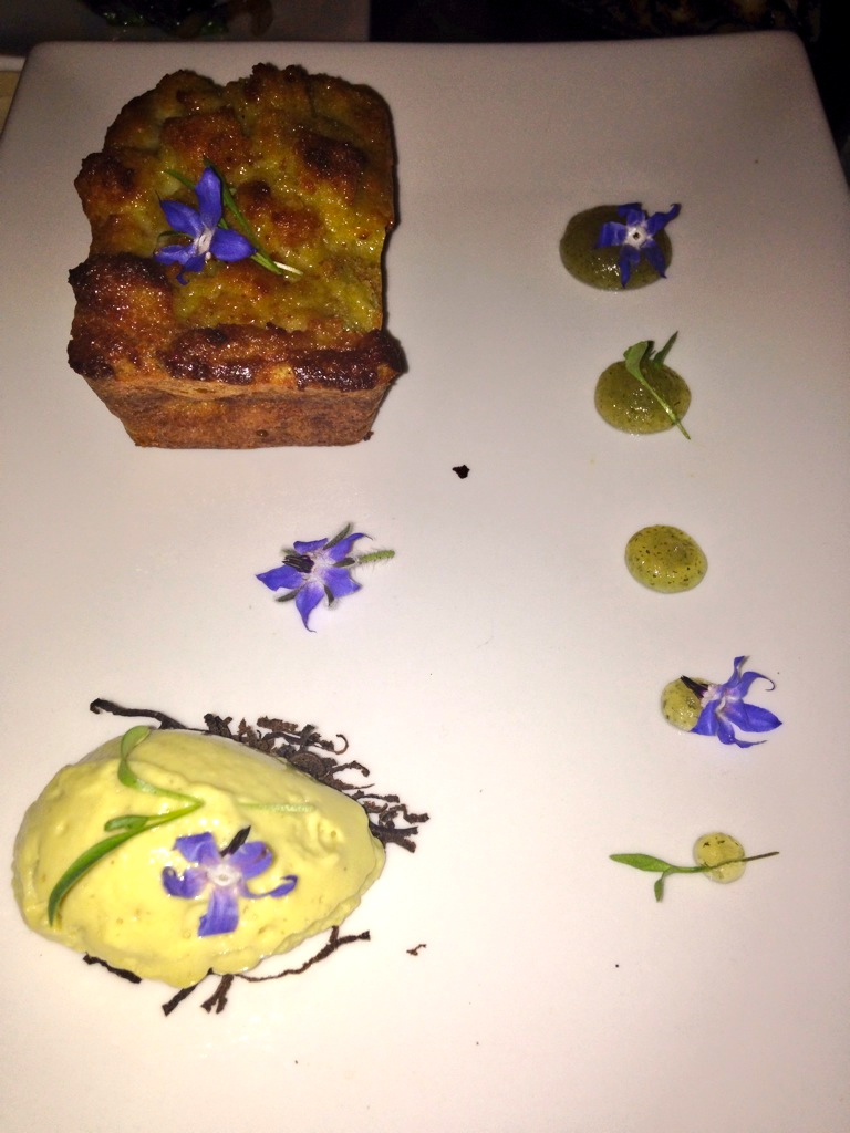 presented, I almost didn’t want to cut into it. The bread arrives on a plank with a scoop of jalapeno butter that looks like vanilla ice cream. Then this talented chef adds drops of olive green colored tequila and cilantro jelly and tops them with tiny purple flowers. There are shavings of citrus charcoal adorning the dish. It offers such a “wow” factor that diners at a nearby table decided to order one too.