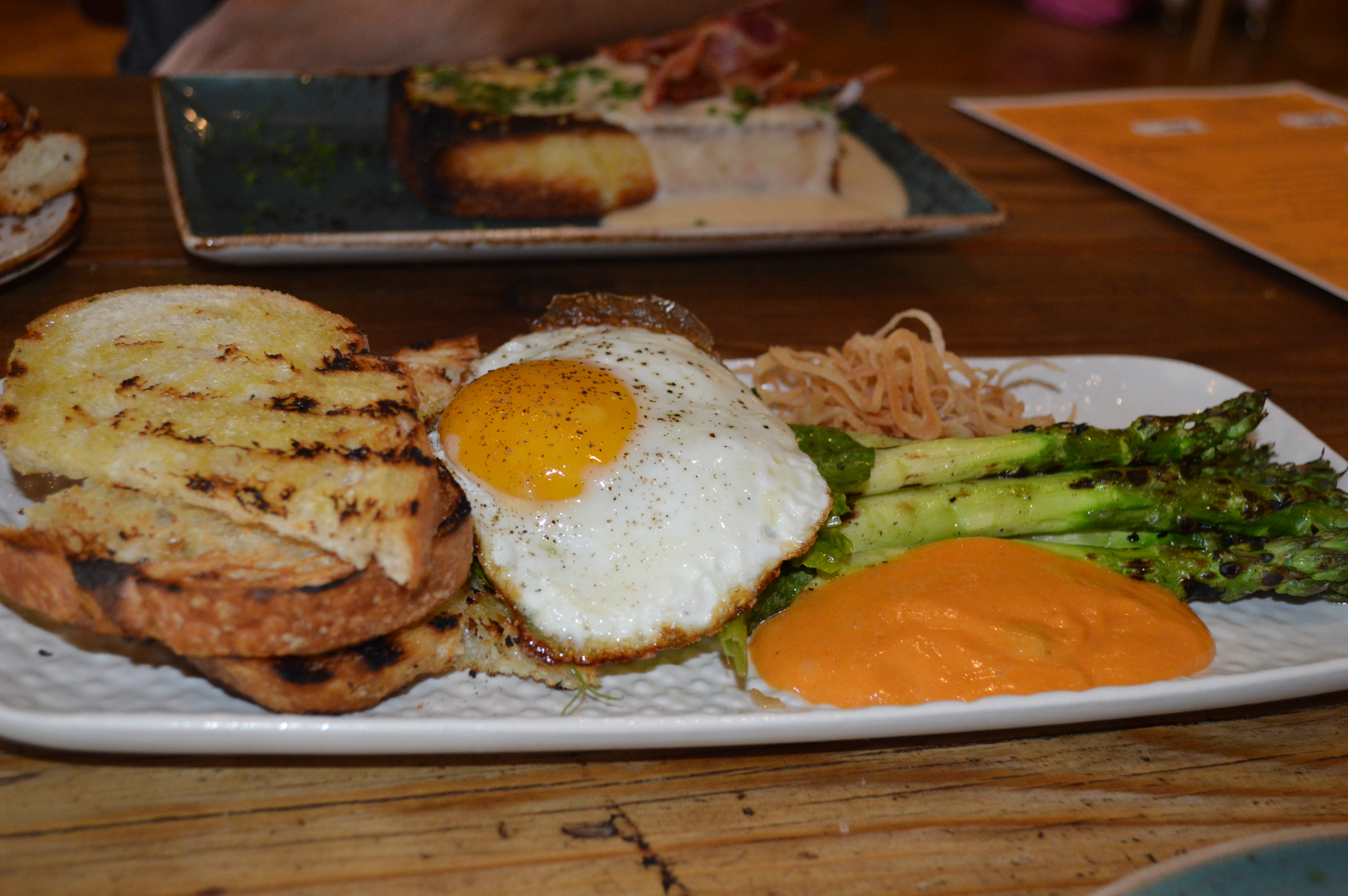 The brunch menu includes some exciting entrees such as the Toad in the Hole – a Corque Madame served on brioche bread with an egg in the middle smothered in a Gruyere fondue and topped with crispy smoked bacon. Another dish is the grilled asparagus with a sunny side up egg and the most decadent smoked tomato Hollandaise sauce. Every egg dish should have this sauce. It’s exquisite.