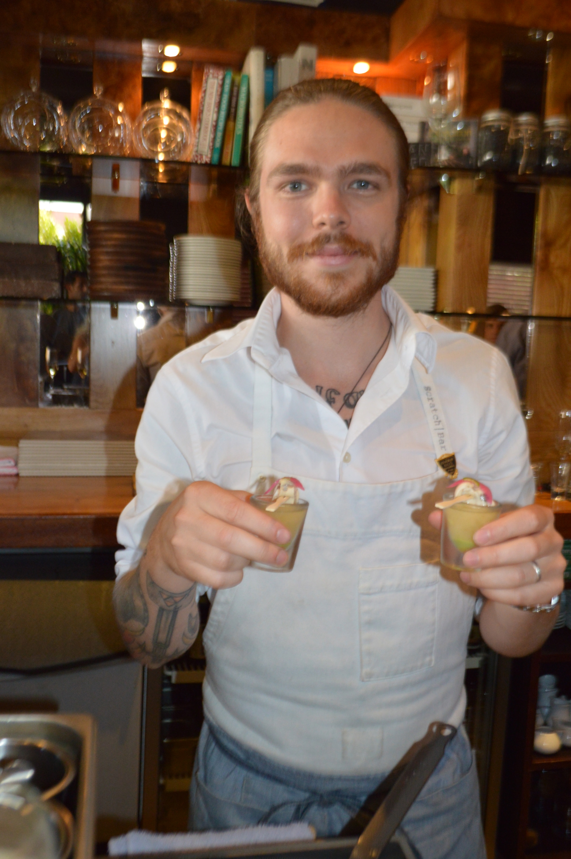 The first plate was actually a shot glass with a green mussel shooter. Chef Phillip told us to eat this in a three-step process. First, we were to take the skewer and bite into the sake enhanced green mussel. Then we were to throw back the unfiltered sake and lime juice. Last, we were instructed to skewer and poke the avocado mousse to find a sea urchin treasure surprise on the bottom.