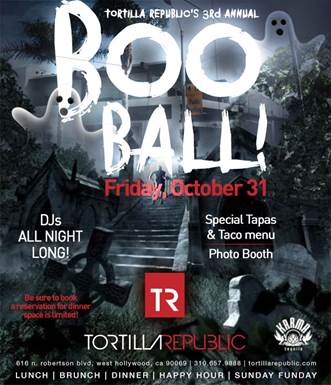 Tortilla Republic is hosting its annual “Boo Ball” on Friday, Oct. 31 from 8 p.m. to 2 a.m., with specialty cocktails and bites, live music, a photo booth and festive décor. Menu items include seared albacore tuna bites with an ancho chile crust, mango and radish slaw, avocado and salted chili lime. Tortilla Republic’s “Boo Sliders” are three mini hamburgers made with premium American Wagyu beef, roasted poblano chile, caramelized onion, chipotle aioli, watercress and sweet potato fries with cilantro and lime zest. The prime tenderloin steak taco is made with a fajita rub, salsa de mesa and tequila slaw. Festive margaritas will also be available. 616 N. Robertson Blvd. (310)657-9888.