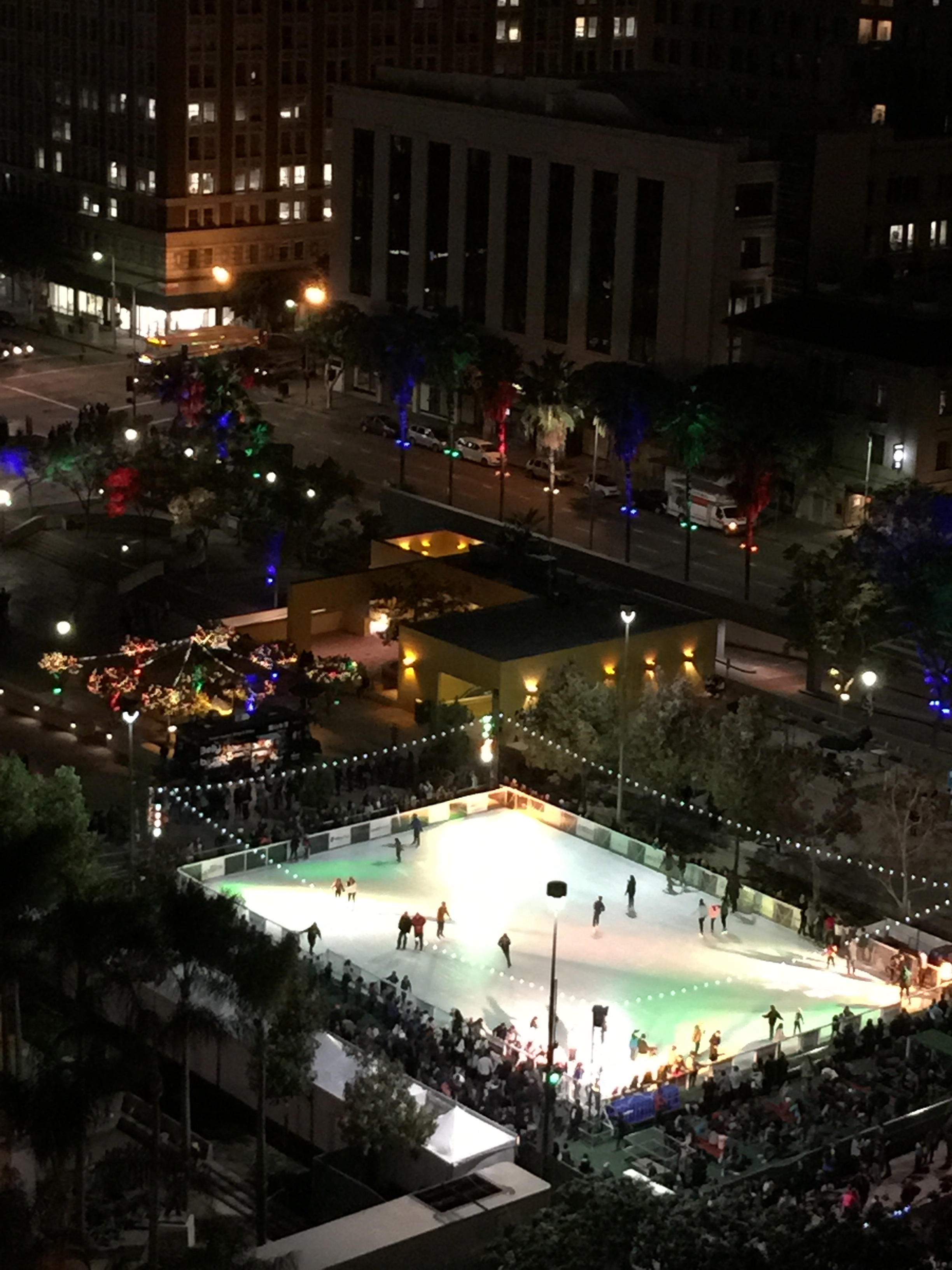 Even though the temperature was in the 40s, we sat outside near the back corner on whicker couches with a wood coffee table for dining. Nearby, the Ben Ross three-piece jazz band entertained guests. Below was Pershing Square with palm trees aglow in red, green and blue lights and an outdoor ice-skating rink framed by skyscrapers. Beyond were sparkling lights all the way to the Pacific Ocean.