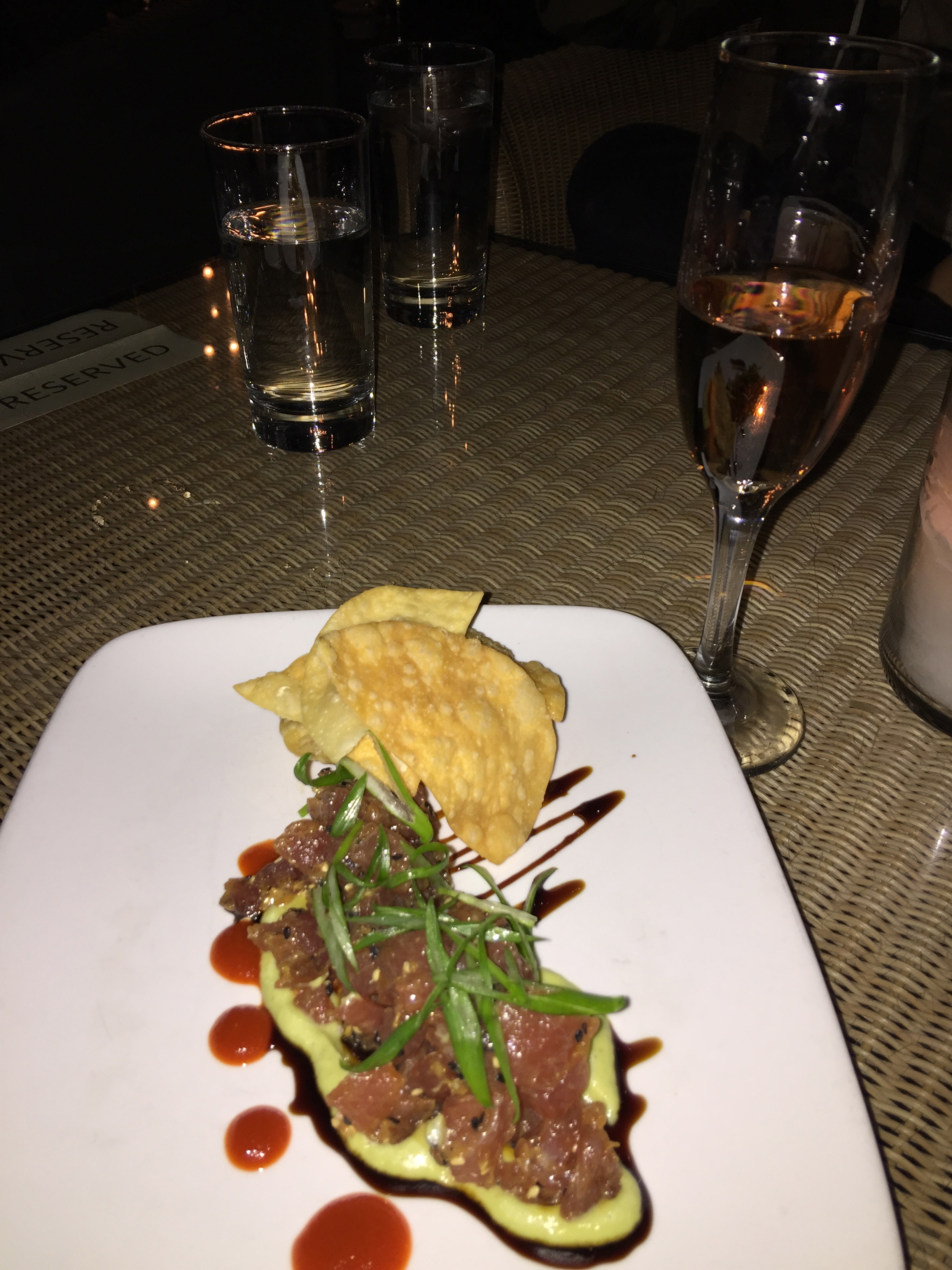 We started with a French tradition, a bubbly Kir Royal. After a toast, we ordered two appetizers, the Ahi Tuna Tartar and grilled