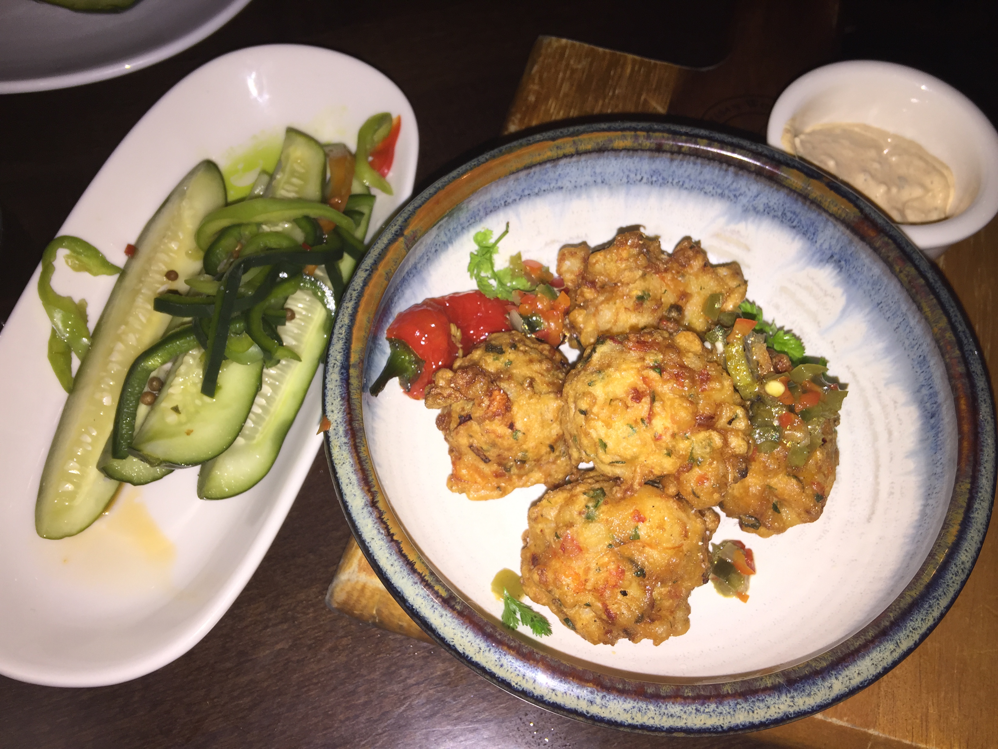 My husband sipped the pretty West Side cocktail with Grey Goose vodka, lime, Orgeat, cucumber, mint and angostura bitters. Both went well with the lightly fried smoked shrimp beignets served with a preserved lemon tartar sauce. They were filled with lot’s of shrimp pieces and fun to pop in our mouth.