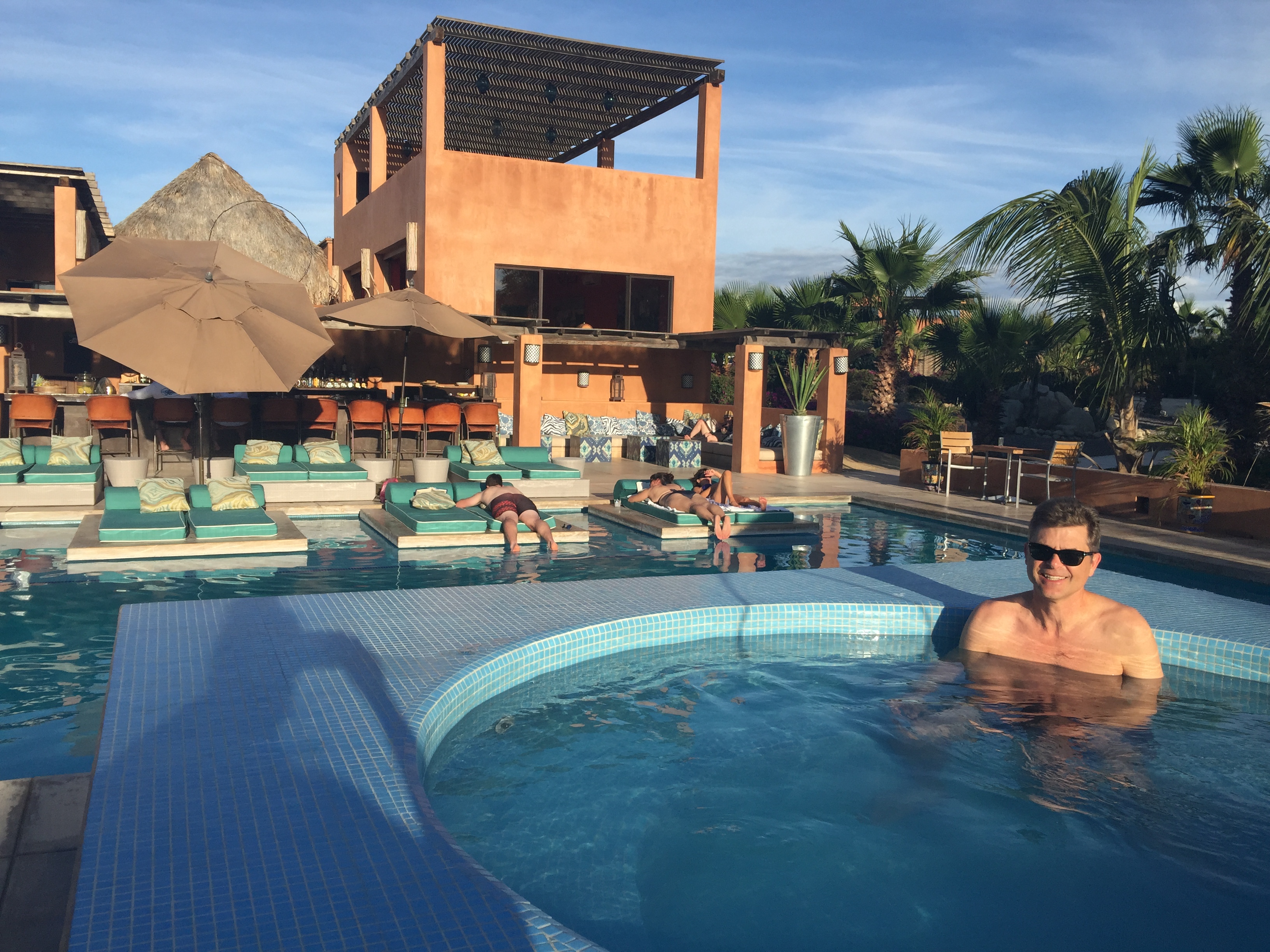Sitting in the raised hot tub overlooking the stunning pool and bar area of the elegant boutique resort, Rancho Pescadero guests congregate in the hot, bubbly water. Many are here to take a yoga class or sit in one of the “floating” chaise lounges in the pool with a cool hibiscus margarita.