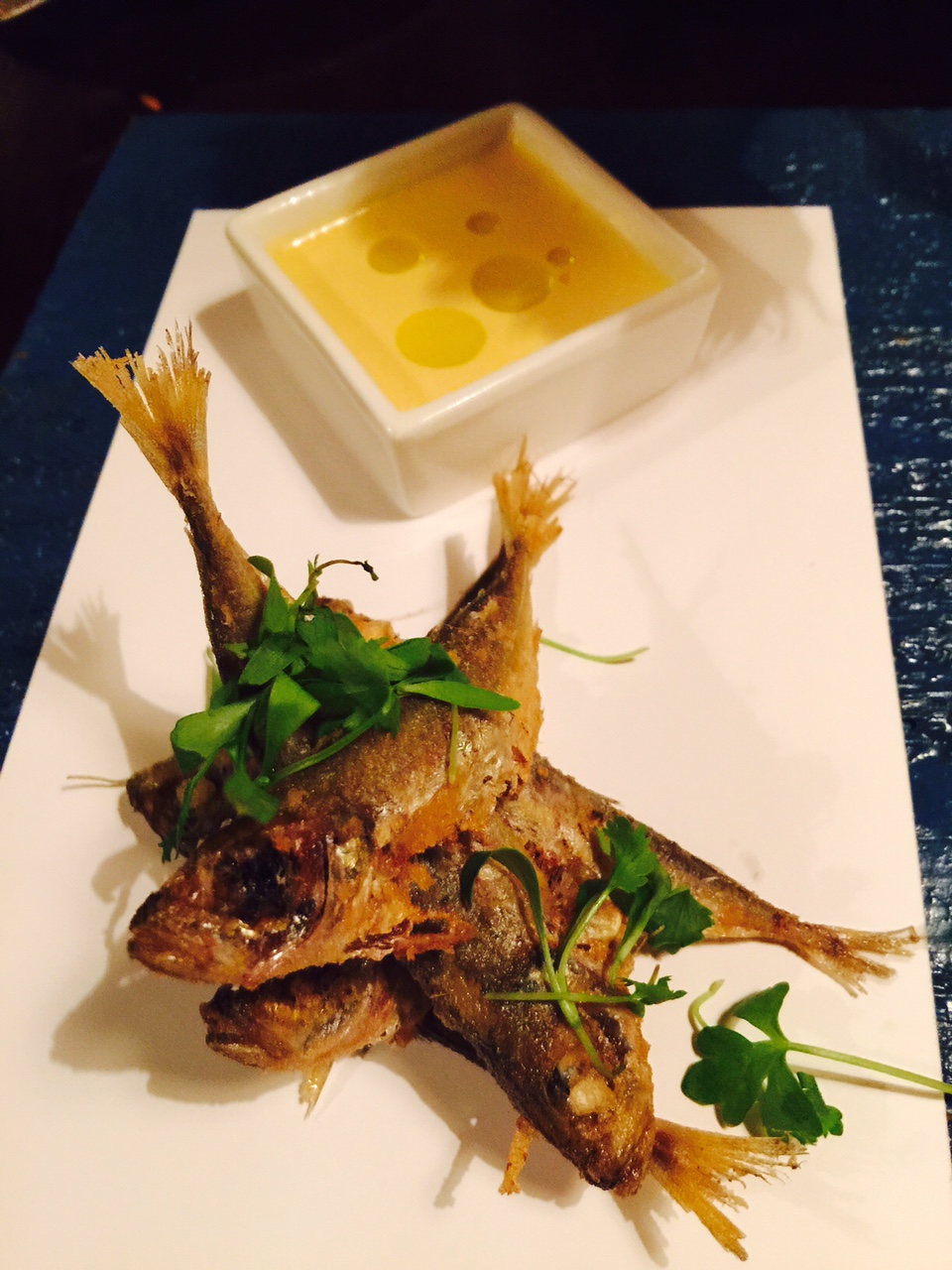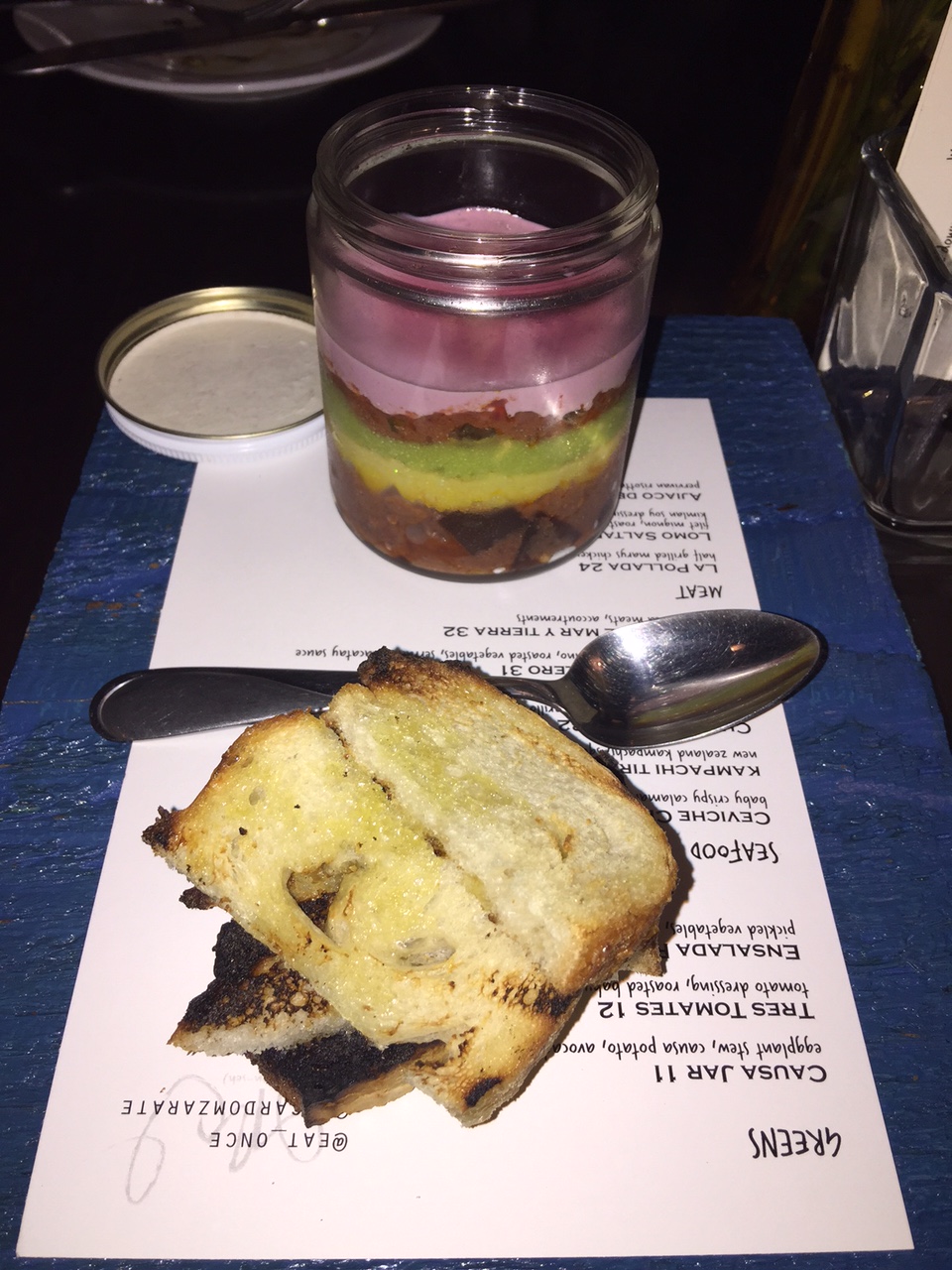 My favorite starter was the Peruvian causa in a mason jar. Causa is a popular layered Peruvian potato dish served cold. Zarate starts with a base of Peruvian black botija olive aioli, layers it with smooth avocado and mashed yellow potatoes, and tops it with a beautiful, thick, eggplant stew with pieces of the dark purple skin. It’s served with thinly sliced grilled bread brushed with oil. Causa has the consistency of budino, and is an exquisite spread on the toasted bread.