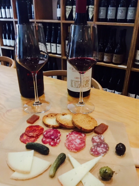 We finished with a big red and a wood plank with a variety of cheese and charcuterie. The red was a pour of Dolcetto d’Alba 2014 made with 100% Dolcetto grapes. The varietal notes of cherry, blackberry and plum rounded off by aromas of red fruit and almonds went nicely with LaGambina’s slices of Manchego cheese, thin slices of deep red Spanish chorizo, French “Sanglier” wild boar and Italian with fennel, with cubes of quince paste and a few olives.