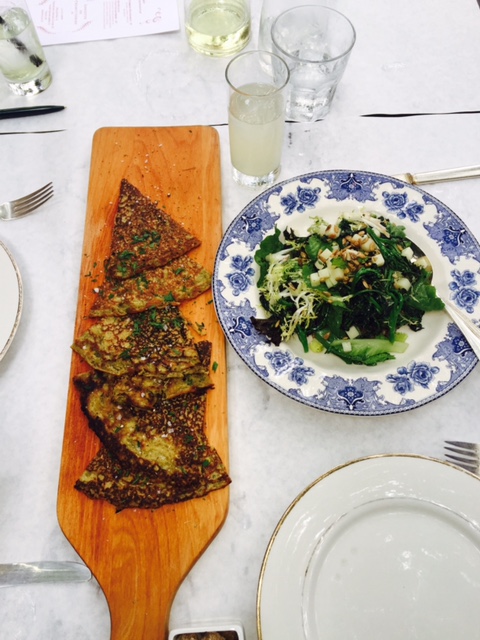 While looking over the menu outside on the appealing patio, I wanted to order what I enjoyed last time – The avocado toast with tarragon salsa verde, and Meyer lemon. Instead I ordered the Socca to share with a new broccoli and chicory salad. Both were excellent together. Socca is a street food found in Nice, France. It’s made from chickpeas into a thin pancake, almost like a crepe. It’s dusted with fennel powder, coarse salt and pepper. Served on a wood plank it was cut into triangles.