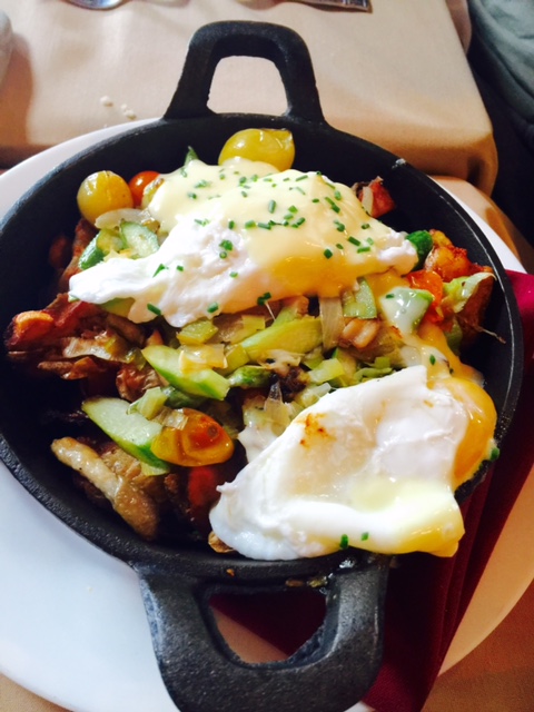 My daughter chose the vegetable skillet, that was hot and lined with smooshed potatoes and topped with sautéed veggies, poached eggs and a flavorful citrusy Hollandaise sauce that wasn’t heavy or gelatinous. The eggs continued to cook before the skillet cooled down. I remarked to my daughter this dish was similar to our favorite Korean bibimbap, yet with different ingredients.