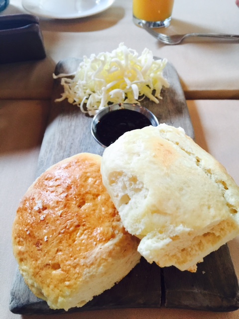 There are a variety of signature Proper dishes such as egg dishes, crab cakes, chopped salads, and fluffy pancakes. Our server Tiffany came over to our corner table with two enormous buttermilk biscuits on a wood plank that were sprinkled with sea salt. There was a silver container of berry jam and shredded butter that looked like shredded mozzarella cheese. The butter was so smooth and easy to spread on the warm biscuits. It was a fun starter to share among the table.