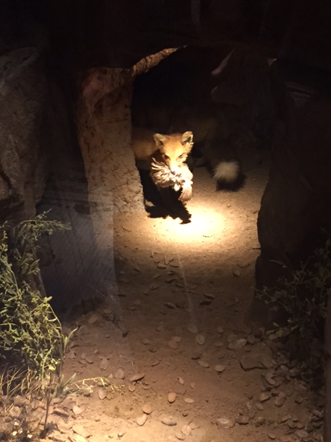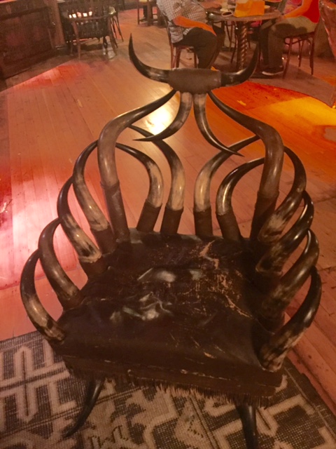 Once we paid for the items on our tray, we searched for a table on the first floor. Upstairs on the second floor had an even more interesting dining room, but without an elevator for the public, we had to walk up a flight of stairs with our trays in hand. Since my Dad needed to hold onto the hand rails, I carried his tray to a really cool area near a massive tree and a glass diorama with a burly buffalo. We sat on Bovine horn and deer antler chairs.