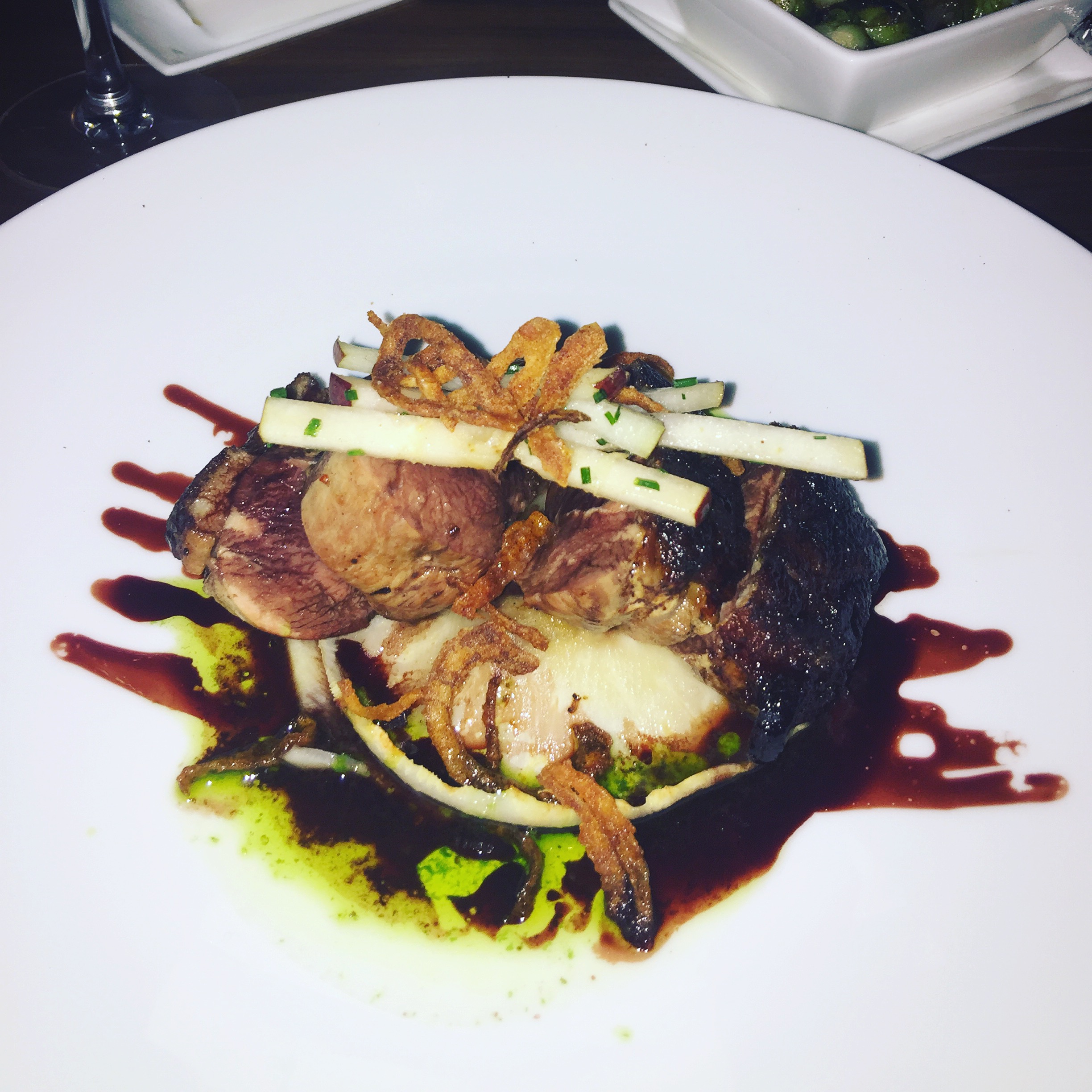 Entree – Chef Turano is an expert at seafood with his grilled red wine glazed octopus with pickled ramp aioli, spiced crisp chickpeas, and a radish salad. We also ordered his wild halibut entree. It’s delivered to his kitchen as a whole fish before Turano butchers the 30 pound fish himself. One side of the halibut is pure white in color, the other side is darker and more gray. He takes the pure white meat of the fish and prepares it with three different cauliflowers. It’s served with a blond gastrique made with Chardonnay and sprinkled of sugar and butter. The dish is colorful with small green cauliflower florets and pickled beech mushrooms.