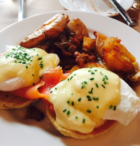 Brunch Fare – The salmon Benedict with smoked salmon on two English muffins topped with poached eggs and a pleasing citrusy Hollandaise sauce. I love the smooshed potatoes.