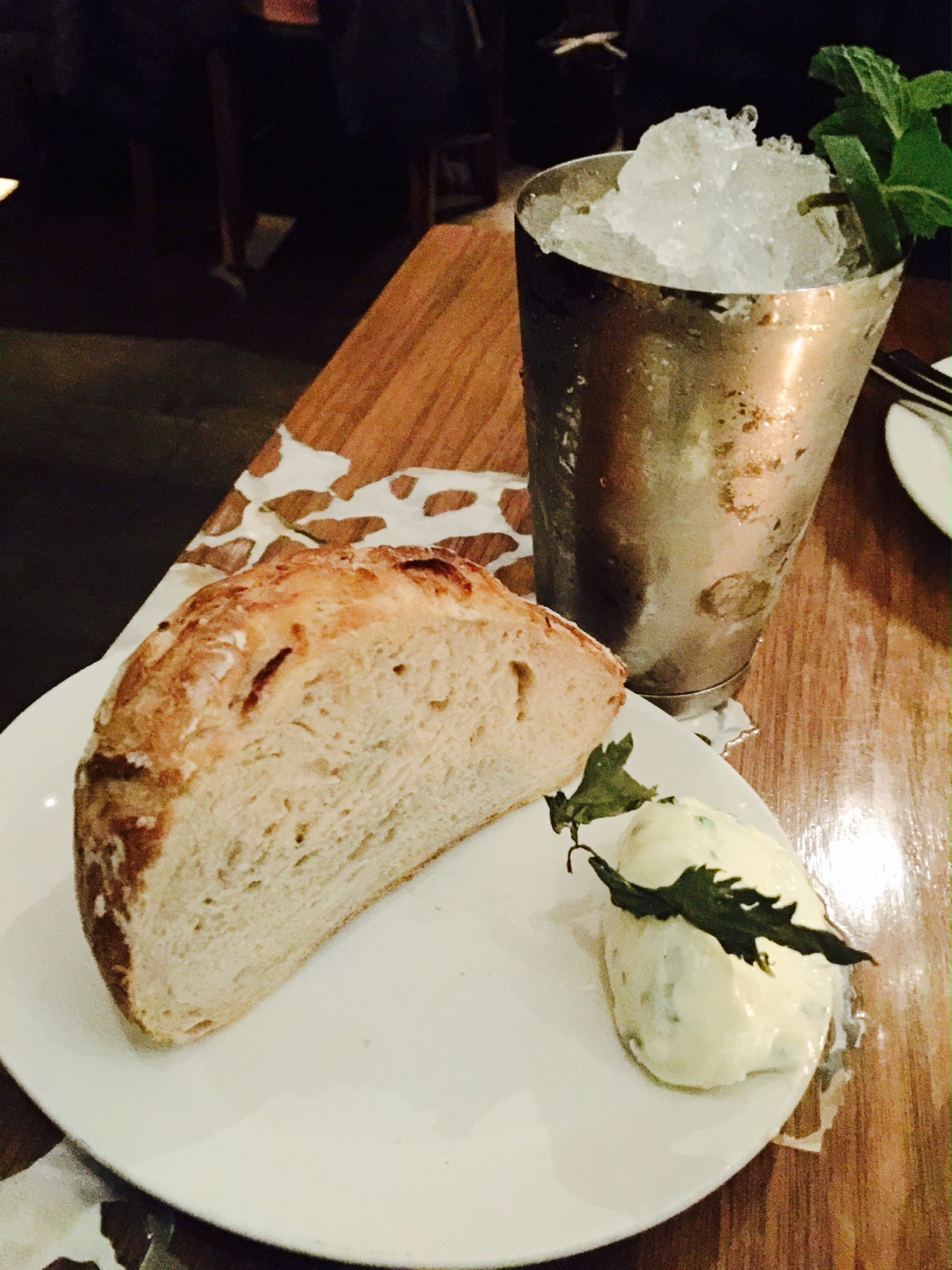 fullsizerender-37Starter –Enormous buttermilk biscuits on a wood plank that were sprinkled with sea salt. There was a silver container of berry jam and shredded butter that looked like shredded mozzarella cheese. The butter was so smooth and easy to spread on the warm biscuits. It was a fun starter to share among the table.