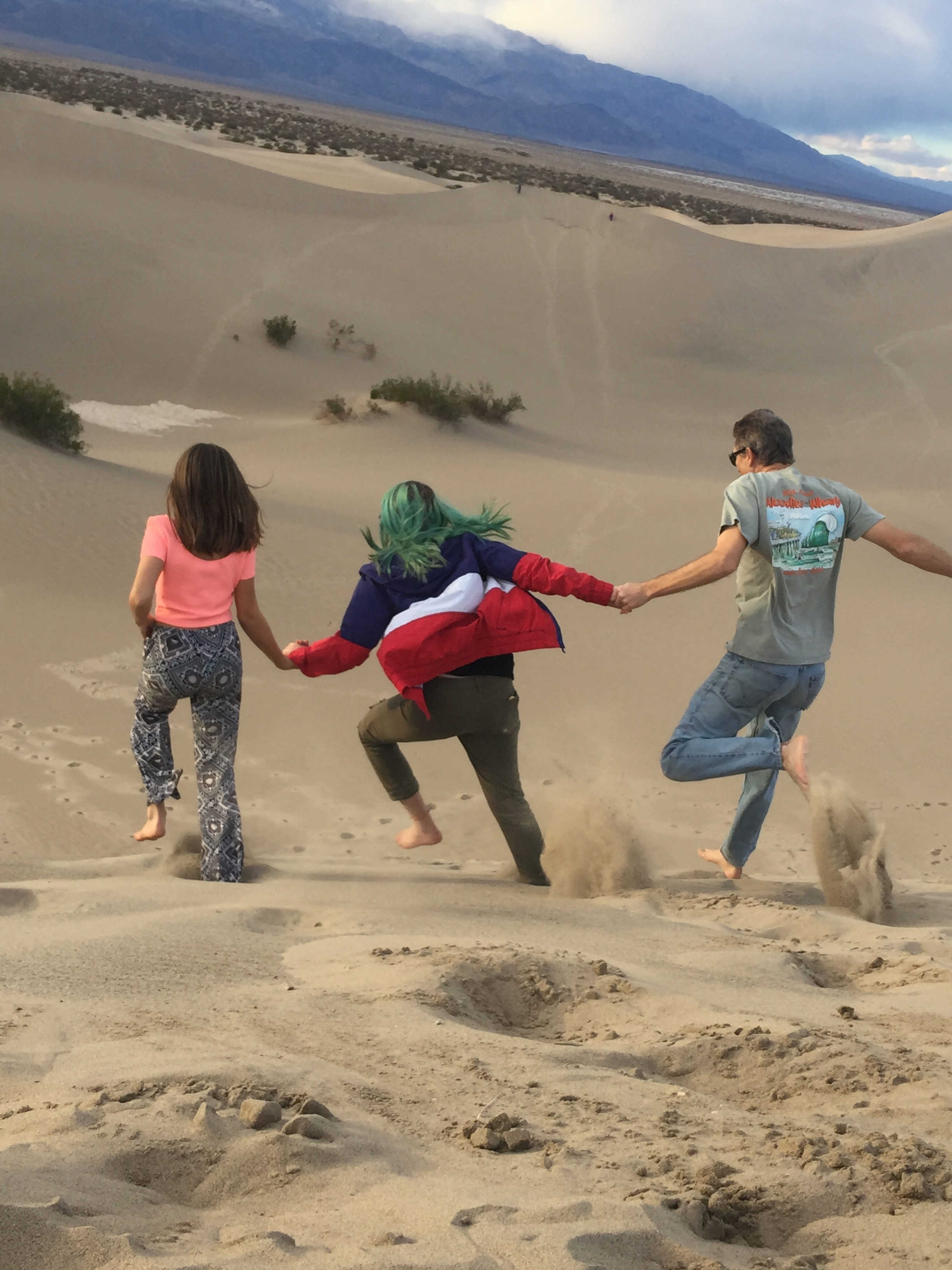 There are up to 150-foot sand dunes created from sand from the Cottonwood Mountains rising in the middle of flat desert land. They are spectacular tiny grains of quartz and feldspar. Our girls took off their shoes and ran up and down dunes for almost one hour. My husband even took off his shoes to join them.