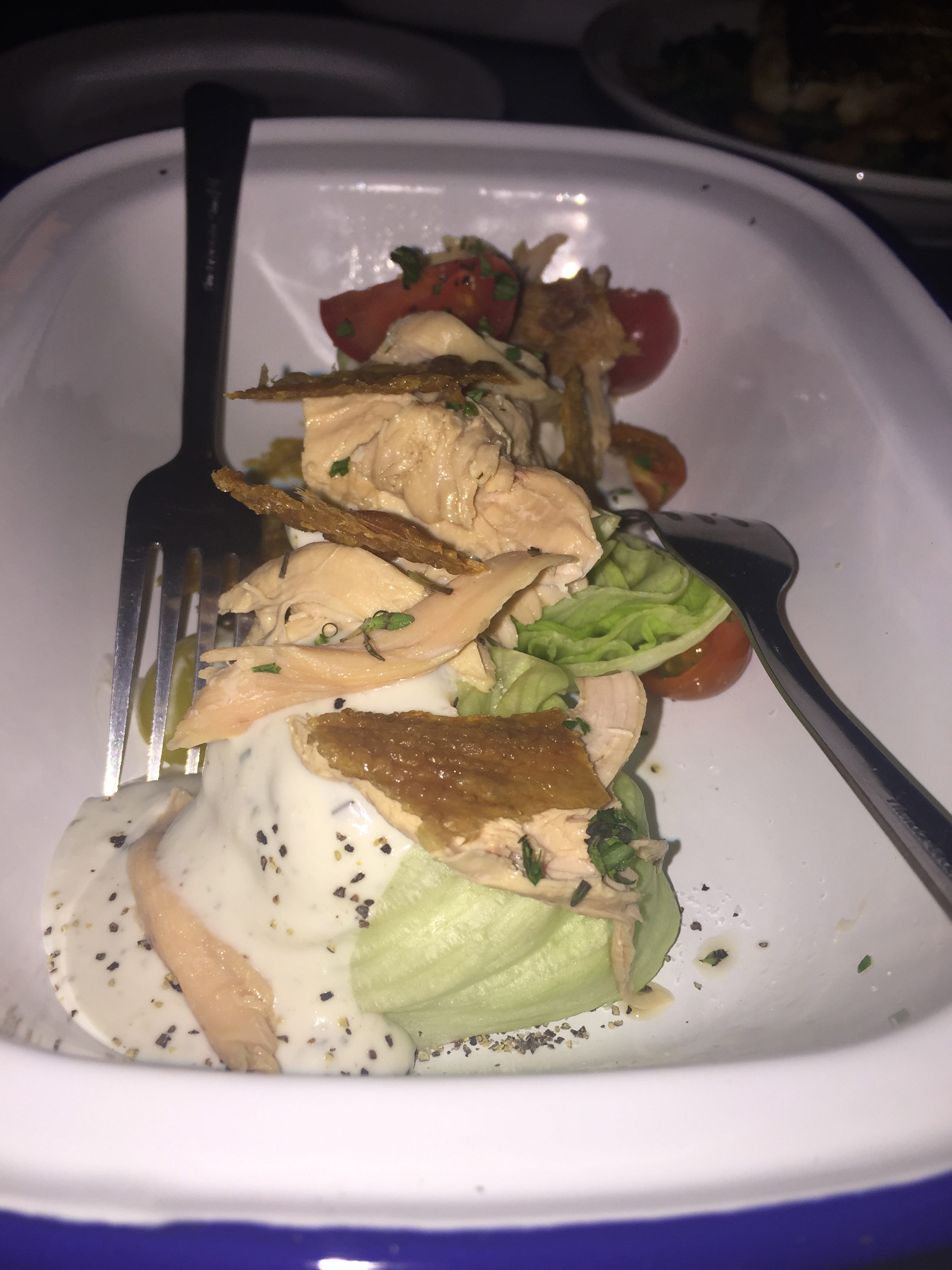 Our order of the baby iceberg wedge was different than a traditional wedge with small wedges topped with heirloom cherry tomatoes. Instead of the traditional crumbled bacon, the salad has pieces of moist rotisserie chicken and crispy chicken skin on top. It’s dressed with a pleasing Point Reyes blue cheese dressing. At first the crisp chicken skin looked like potato chips, yet when I bit into one, it was much more flavorful.