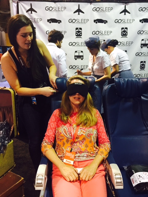 - Sit in an airplane chair and have the GoSleep representatives put one of their patented upright sleep system masks over your eyes. You will want to bring one of these on your next red-eye or International flight to sleep restfully and not bob your head or get a stiff neck. Igenious! Booth 242.