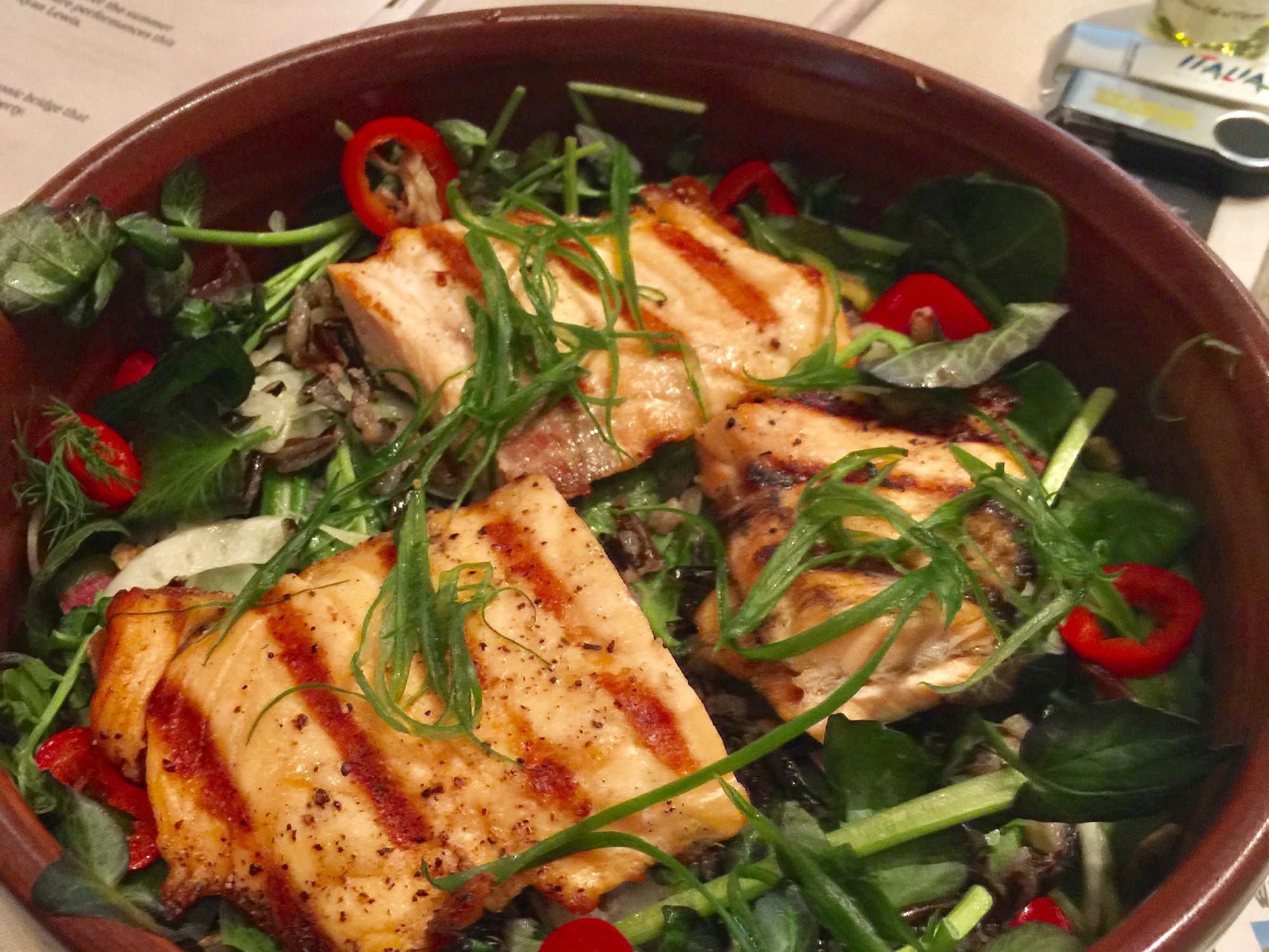 Another pleasing salad was the perfectly grilled salmon filet on a bed of wild rice with sliced red peppers, radish, fennel and watercress. This was dressed with a subtle pistachio oil vinaigrette.