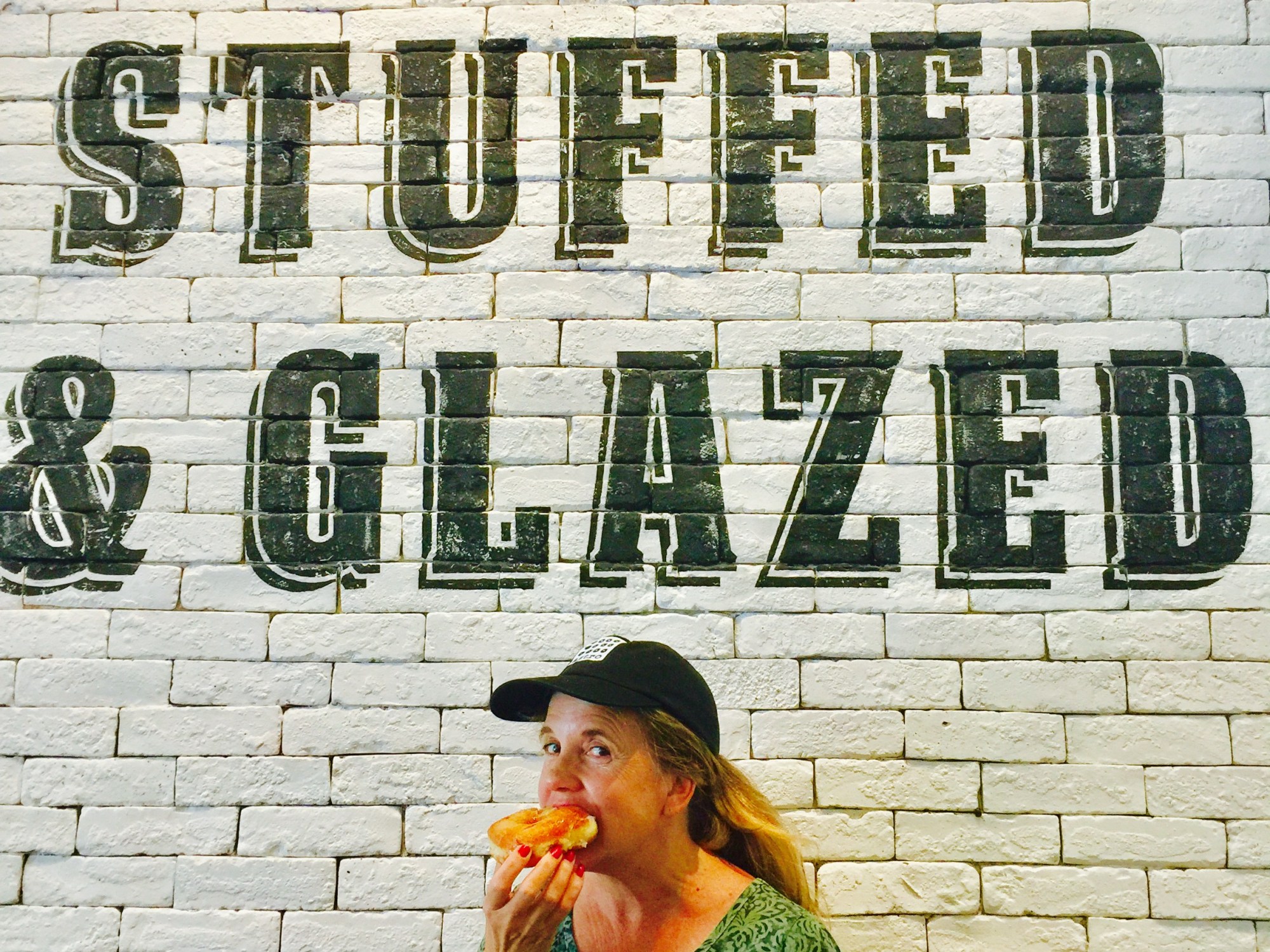 Walking inside the modern interior, I first noticed a white painted wall with the words FRIED, STUFFED & GLAZED in big black letters. Below were dark wood tables and heavy reclaimed wood and metal chairs. There’s more seating on high stools near the glass display counter featuring an array of colorful doughnuts.