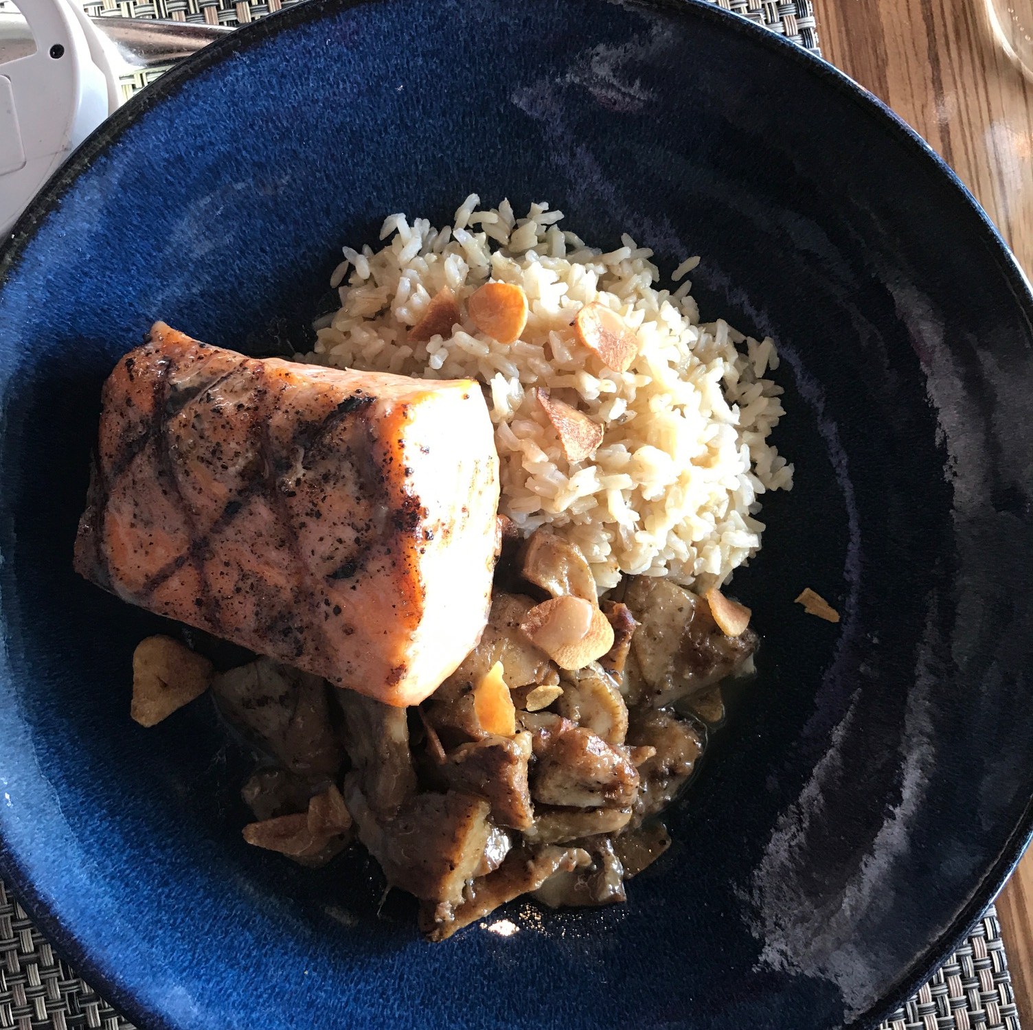 I selected brown rice, grilled salmon, artichoke, crispy garlic chips and a tahini dressing on top. The soft artichoke quarters mixed with crunchy garlic chips was a nice balance of textures.