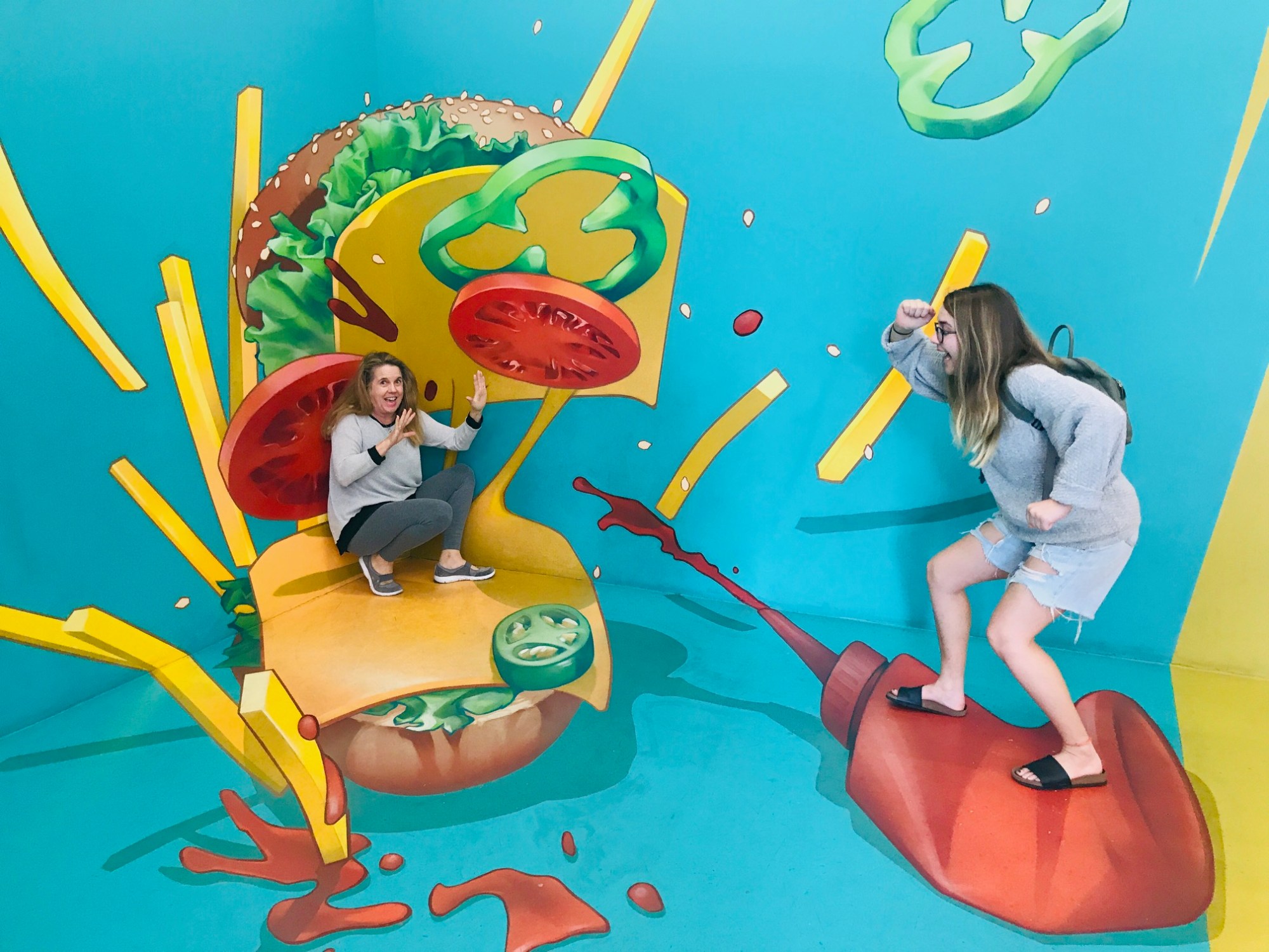 Foodies will enjoy a few fun murals that include wrestling with an octopus in a take-out box, and stomping on a ketchup bottle to enhance a giant burger and getting into a tomato fight with a duo dressed in ketchup bottles.