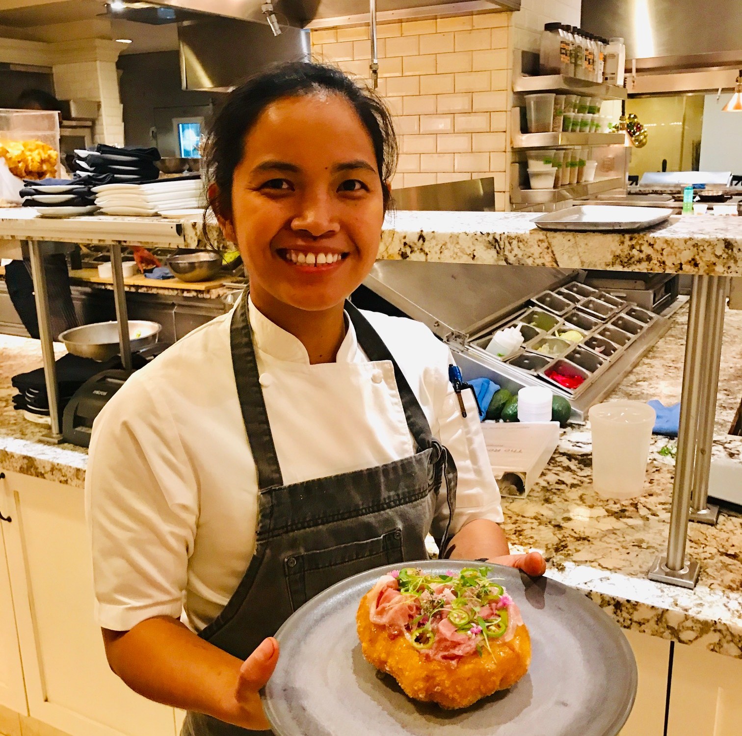 Her passion as a farmer and traveler inspires her to create exquisite seasonal dishes at The Restaurant. One of her signature dishes that wow’d me was her Fry bread. Chef Monica told me that while hiking in the Grand Canyon, she met some native Americans who were making this wonderful bread. It was warm and the best she had ever tasted, inspiring her to make something similar in Beverly Hills. Her puffy Fry bread is topped with prosciutto, Serrano chili, and a secret juniper and tarragon topping.