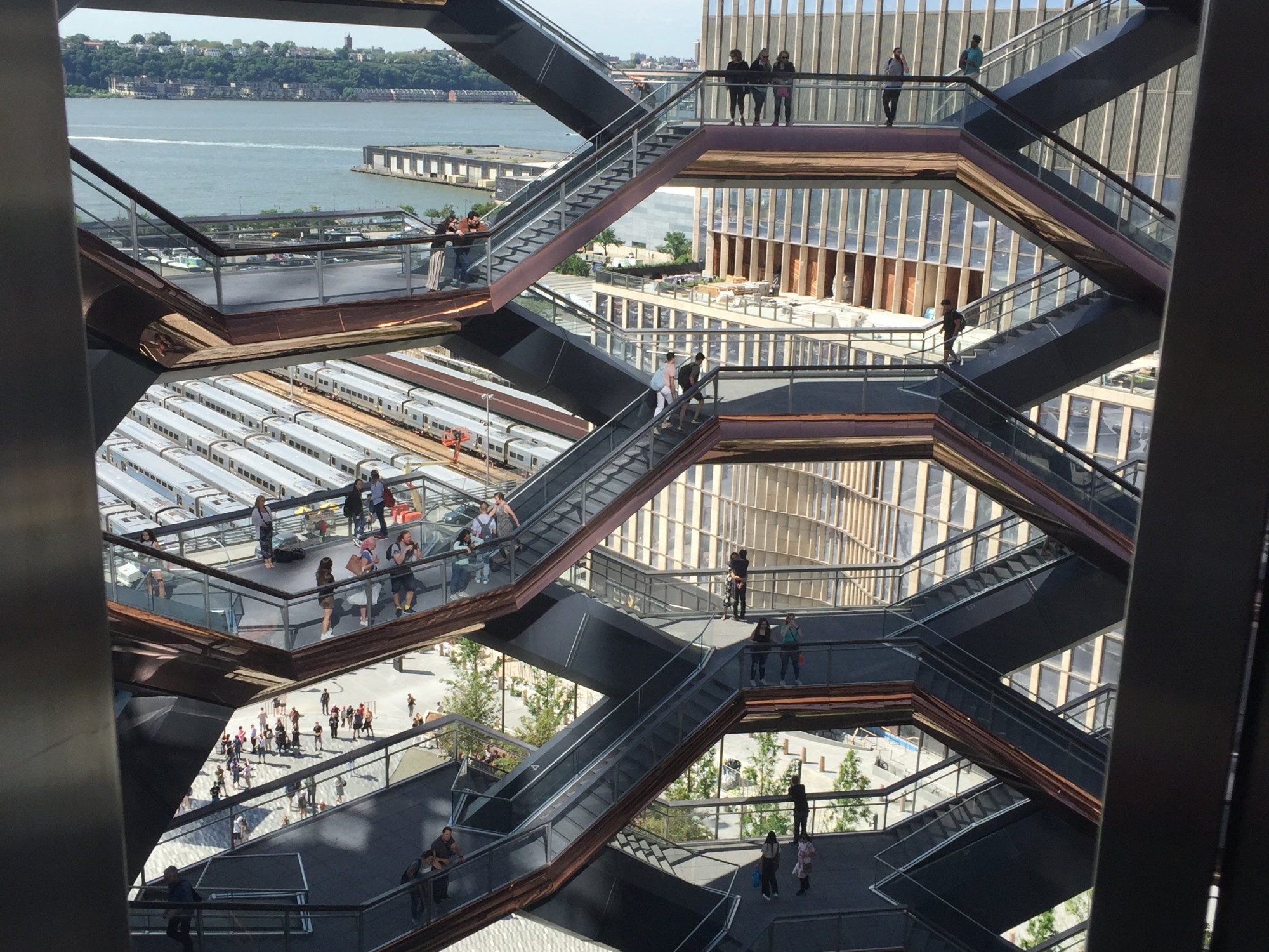From the Vessel, one can see people walking along the 1.45 mile-long High Line elevated park. It’s a peaceful spot offering art work sprinkled among flowering perennials beds, and a mix of grasses. American Sweetgum trees provide shade in sitting areas on a rail trail developed on a former New York Central Railroad. The Diller – von Furstenberg Sundeck is one of the High Line’s most popular gathering spots. There are plenty of benches and lounge chairs to rest and enjoy this picturesque area of the city.