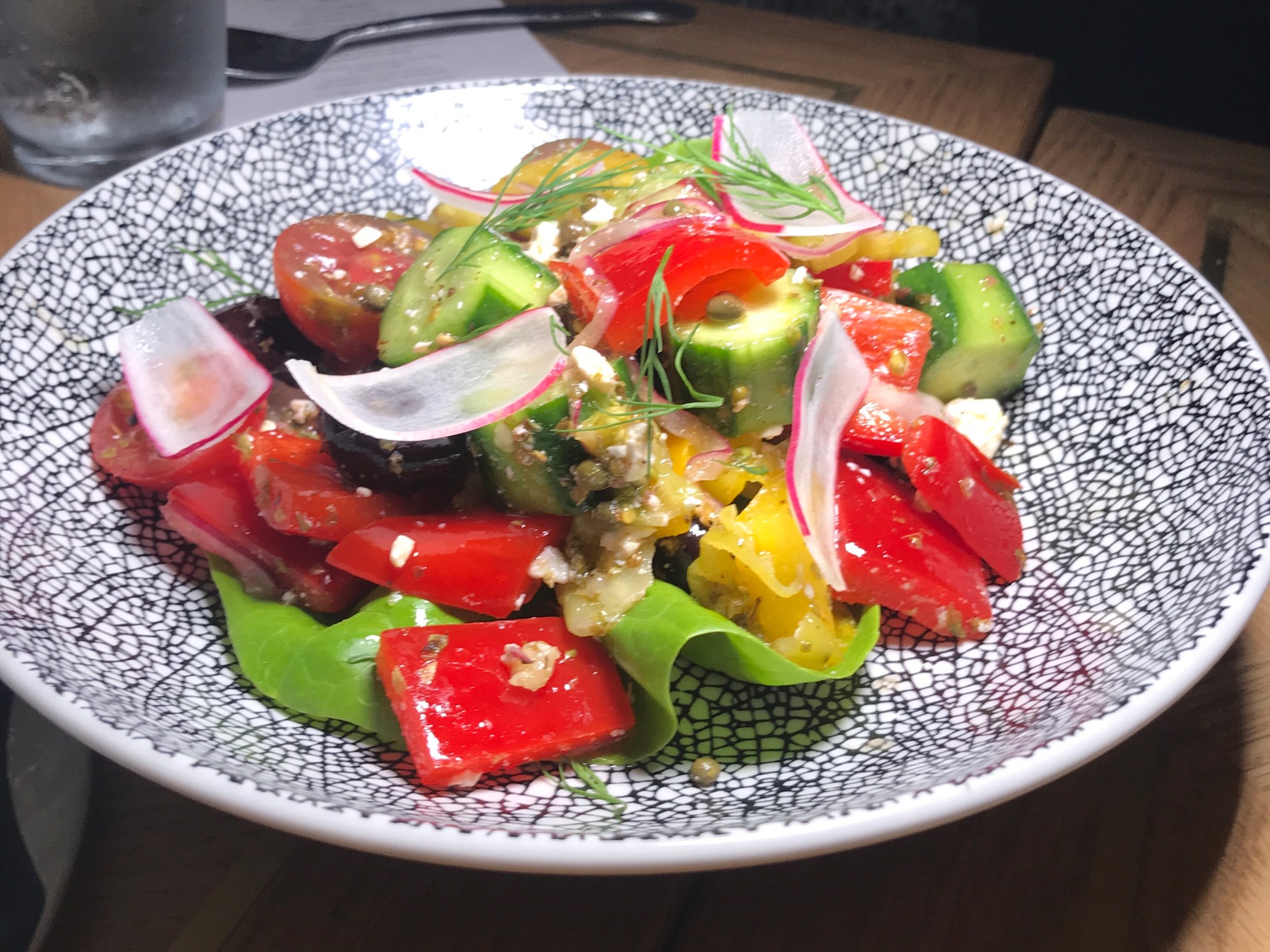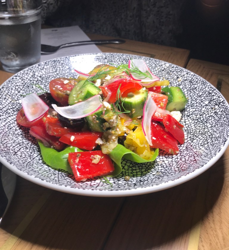 Delicious salads on the menu include a colorful Greek salad mixed with kalamata olives, crumbled feta, banana peppers, sliced cucumbers, bell peppers and capers with a handful of torn lettuce leaves.