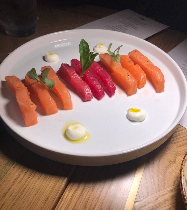 Heierling is very proud of his cured salmon – a trio of bite-sized natural, beet and truffle-cured slices.