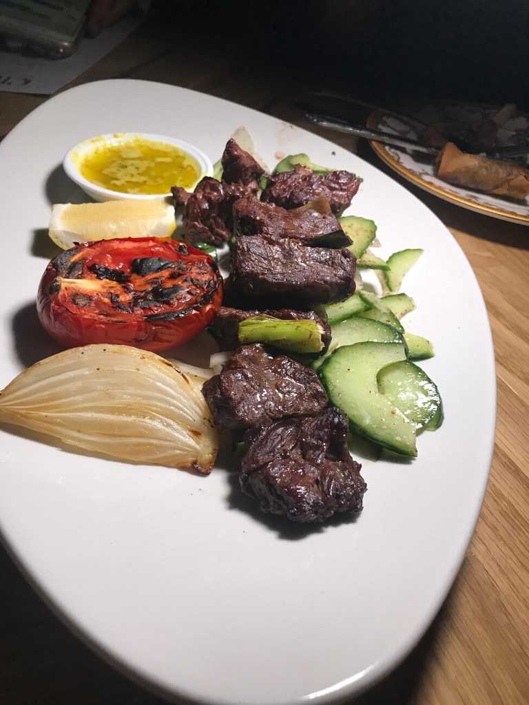 Grilled kebabs of the prime beef and a mixed grill assortment of lamb shawarma, crispy chicken and butcher’s köfte were well seasoned and tasty.