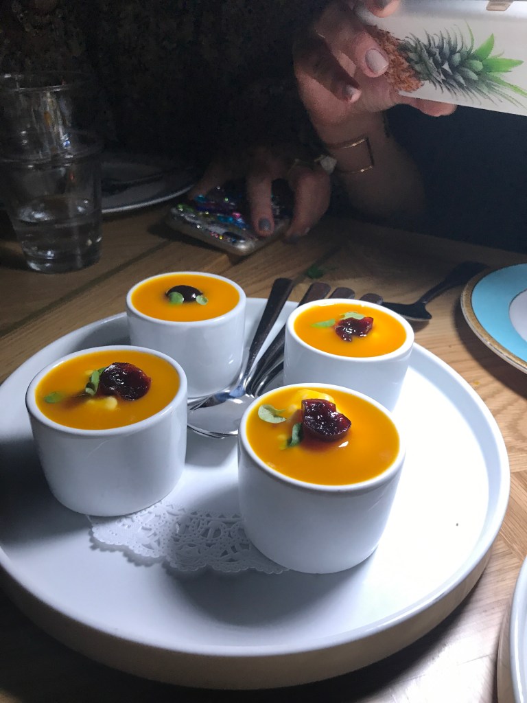 We finished with two wonderful desserts – an Israeli tapioca pudding with passion fruit on top and a Sorrento Meyer lemon curd and sour cream cheesecake. When it was delivered, our server poured a generous amount of limoncello on top of the cheesecake for another dramatic show at the table.