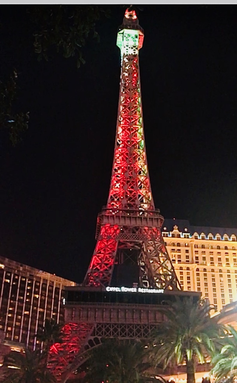 New to the Eiffel Tower is a holiday illuminations light show. Every 30 minutes starting at sunset is a recurring light show featuring over 300 red, green and blue lights choreographed to music, with 800 strobe white lights illuminating the tower’s exterior. The best view is outside of the Paris Hotel.