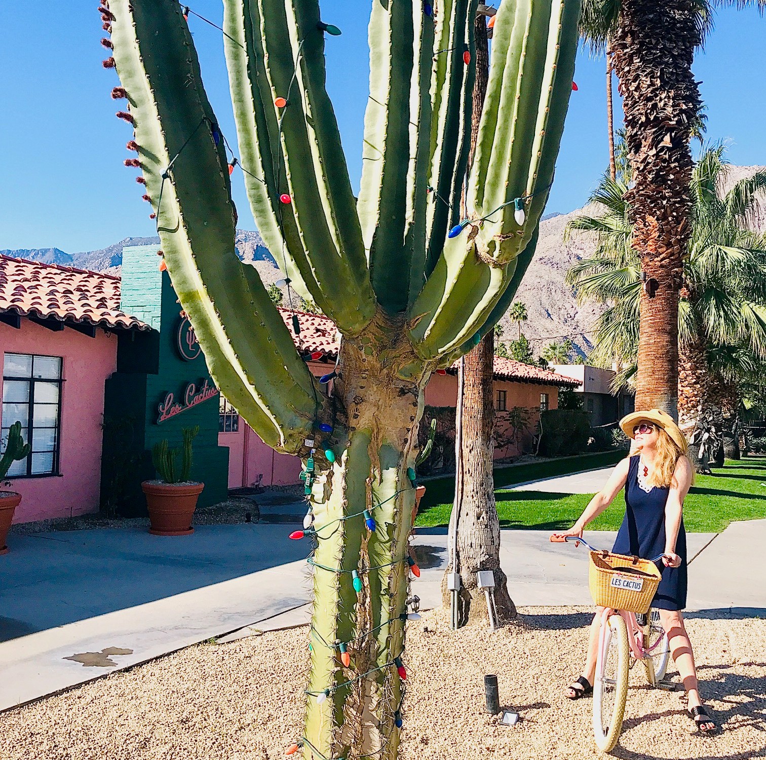Other amenities include pink Les Cactus bicycles with wicker baskets to borrow for a spin around Palm Springs.