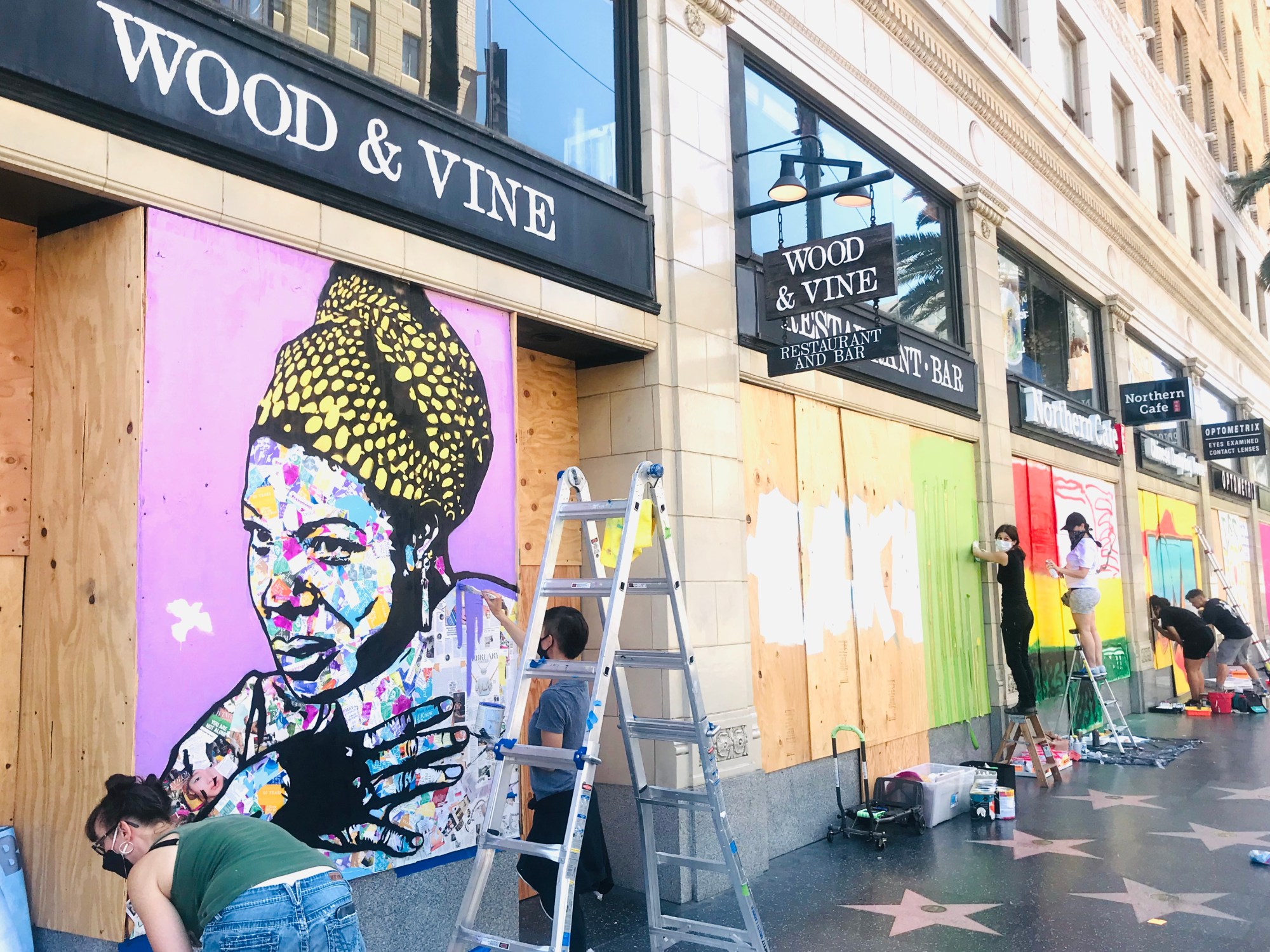 It all started when Wally Moran, General Manager of Wood & Vine Restaurant & Bar boarded the front windows of the restaurant facing out to Hollywood Blvd. He needed to protect the restaurant located in the historic Taft Building, from damage from potential looters that targeted DTLA, the Fairfax District, West Hollywood and Santa Monica.