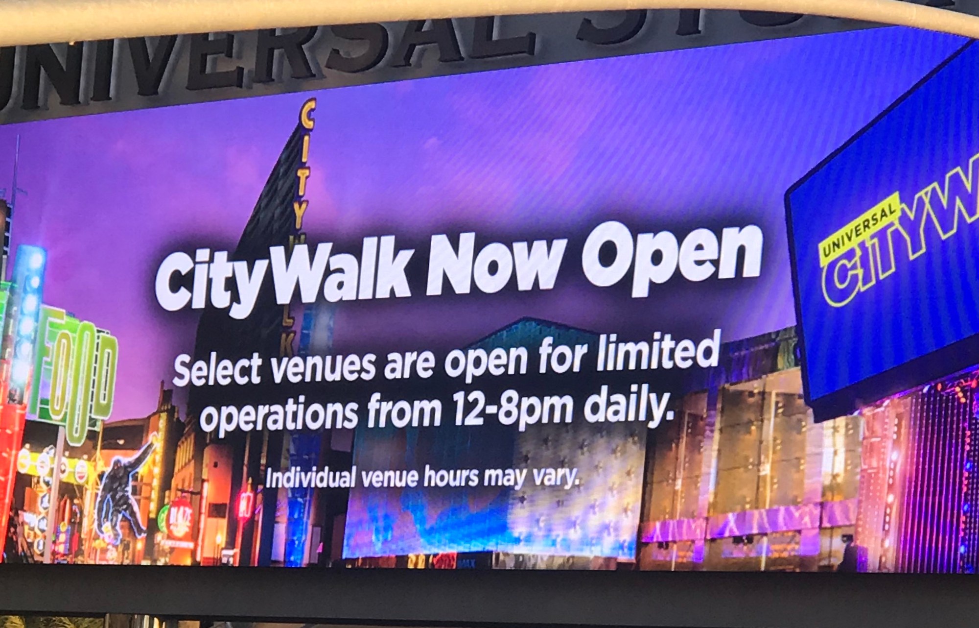 Guests are encouraged to wash their hands with soap and water often for at least 20 seconds. Hand sanitizing machines are strategically placed around CityWalk.City Walk is open daily from 12 p.m. to 8 p.m. Check back for updated hours.
