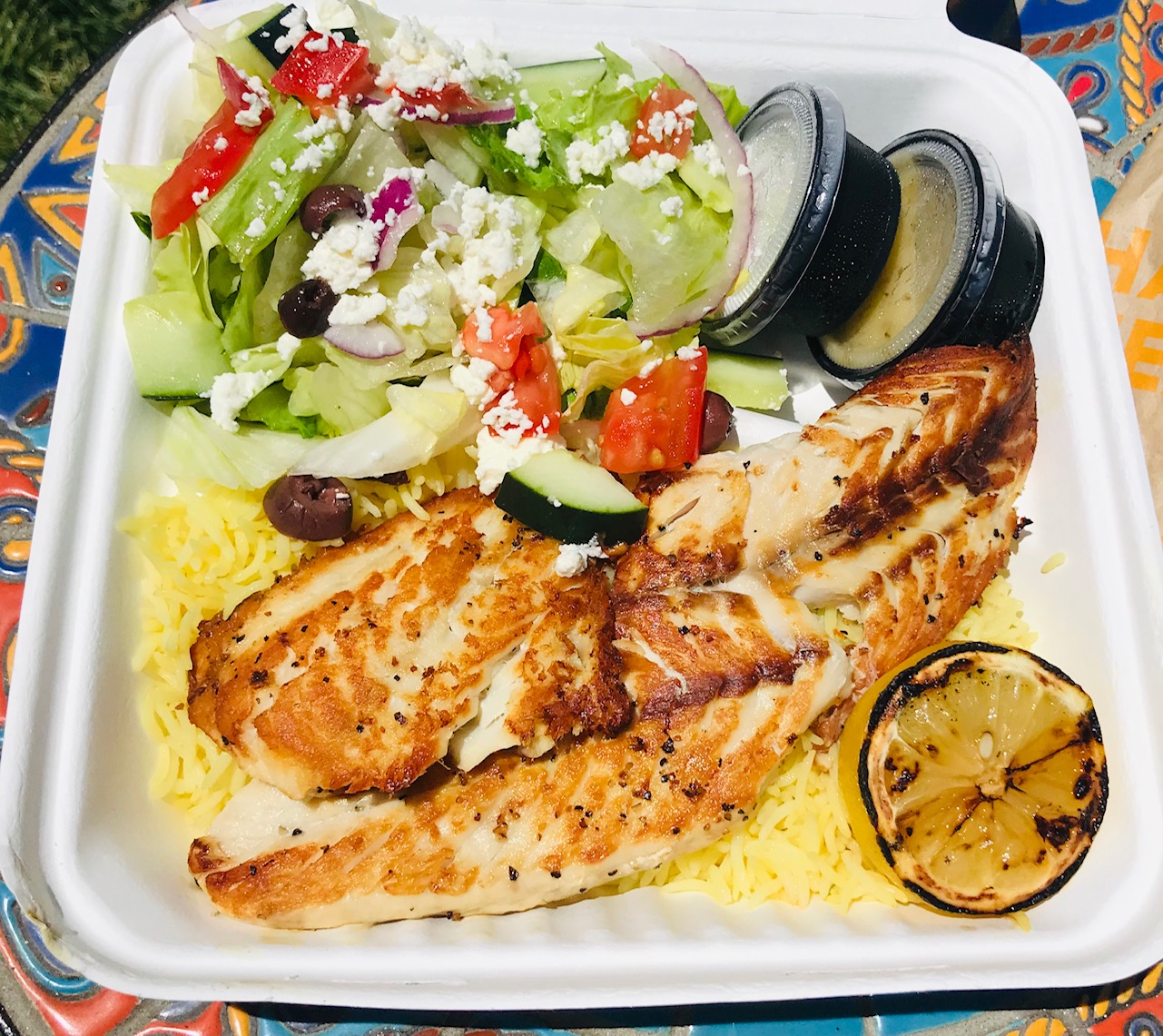 The menu also features a Mix & Match plate that includes two proteins, a Greek side salad, seasoned basmati rice, tzatziki and pita. I ordered the grilled Mediterranean fish plate that had half of a grilled lemon and fresh herbs sprinkled on top. Accompanying this entrée was a Greek side salad, seasoned basmati rice, tzatziki and pita slices. They also offer a Surf & Turf plate that includes grilled shrimp and steak skewers served on a bed of seasoned basmati rice with roasted vegetables, tzatziki and pita bread.